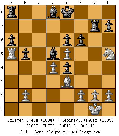 Last move : 0-1 2014 April 13 17:43:20 [Event "FICGS__CHESS__RAPID_C__000119"] [Site "FICGS"] [Date "2014.03.02"] [Round "1"] [White "Vollmer,Steve"] [Black "Kepinski,Janusz"] [Result "0-1"] [WhiteElo "1634"] [BlackElo "1695"] 1.e4 e6 2.d4 d5 3.Nc3 Nf6 4.e5 Ne4 5.Nxe4 dxe4 6.Bc4 a6 7.Ne2 b5 8.Bb3 Bb7 9.Be3 Nc6 10.O-O Na5 11.Qd2 c5 12.c3 Be7 13.Rfd1 cxd4 14.cxd4 Nxb3 15.axb3 Bd5 16.Ra5 Bxb3 17.Rda1 Qc8 18.Ng3 Bd5 19.Nh5 Rg8 20.Rc1 Qd7 21.Qc2 f6 22.Qc7 Qxc7 23.Rxc7 Bd8 24.Rxg7 Rxg7 0-1 French : Steinitz variation Kingside Castling by player White (move 10) Player Black won this chess game. Follow this game move after move (download)That's what Chess is all about. One day you give your opponent a lesson, the next day he gives you one. (Bobby Fischer) Der Traum, für den ich lebe, ist der von einem freien Russland. Viele mögen sagen: Russland hat doch ein Parlament, einen gewählten Präsidenten. Aber ich spüre, dass in meiner Heimat die Angst wiederkehrt. Eine Angst, sich frei zu äußern, bestimmte Dinge zu tun (Garry Kasparov) El jugador táctico sabe que hacer cuando hay algo que hacer; mientras que el estratega sabe que hacer cuando no hay nada que hacer. (Gerald Abrahams) 'L'échange des dames est un coup dur pour les deux adversaires...' Un journaliste lors d'une partie du match Spassky-Fischer Just because you do not take an interest in politics doesn't mean politics won't take an interest in you. (Pericles 430 B.C.)