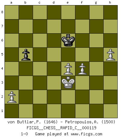 Last move : 1-0 2014 April 4 18:11:32 [Event "FICGS__CHESS__RAPID_C__000119"] [Site "FICGS"] [Date "2014.03.02"] [Round "1"] [White "von Buttlar,Paul"] [Black "Petropoulos,Athanasios"] [Result "1-0"] [WhiteElo "1646"] [BlackElo "1500"] 1.c4 e6 2.d4 d5 3.Nc3 Nf6 4.Nf3 Bb4 5.e3 O-O 6.Bd3 Nbd7 7.O-O Bxc3 8.bxc3 c5 9.Ba3 Qa5 10.Qc1 Re8 11.Rd1 cxd4 12.cxd4 e5 13.dxe5 Nxe5 14.Nxe5 Rxe5 15.Bb2 Re8 16.Bxf6 gxf6 17.cxd5 Kh8 18.Qc4 Rg8 19.Qh4 f5 20.Qf6+ Rg7 21.Bxf5 Bxf5 22.Qxf5 Qc3 23.Rac1 Qa5 24.Qf6 Rag8 25.g3 h5 26.h4 Qd8 27.Qxd8 Rxd8 28.Rc7 f5 29.Rc5 b6 30.Rc6 Rgd7 31.d6 Kg7 32.Kg2 Kf6 33.Kf3 Ke5 34.Rc7 Rxd6 35.Rxd6 Rxd6 36.Rxa7 Re6 37.Rh7 Re8 38.Rxh5 Ra8 39.g4 Rf8 40.Rxf5+ Rxf5+ 41.gxf5 Kxf5 42.e4+ Ke5 43.Ke3 b5 44.f4+ Ke6 45.h5 1-0 English Opening Kingside Castling by player Black (move 5) Kingside Castling by player White (move 7) 10 pieces endgame at move 40 : White KRPPPPP , Black KRP WHITE : King + 1 Rook 5 Pawns BLACK : King + 1 Rook 1 Pawn 9 pieces endgame at move 40 : White KPPPPP , Black KRP WHITE : King + 5 Pawns BLACK : King + 1 Rook 1 Pawn 8 pieces endgame at move 41 : White KPPPPP , Black KP WHITE : King + 5 Pawns BLACK : King + 1 Pawn 7 pieces endgame at move 41 : White KPPPP , Black KP WHITE : King + 4 Pawns BLACK : King + 1 Pawn Player White won this chess game. Follow this game move after move (download)You may learn much more from a game you lose than from a game you win. You will have to lose hundreds of games before becoming a good player. (Jose Raul Capablanca) Offener Brief an US-Präsident Bush anlässlich der Verhaftung Bobby Fishers: Verhaften Sie mich. Stecken Sie mich in dieselbe Zelle wie Bobby Fisher und geben Sie uns ein Schachspiel mit. (Boris Vassilievich Spassky) En manos de Fischer's, una diminuta ventaja teórica es tan buena como tener una Reina de ventaja. (Isaac Kashdan) Votre prénom est 'Tactique', votre deuxième prénom est 'Tactique' et votre nom est 'Tactique'. (Ken Smith) We're missing something. (Gregory House, House M.D.)