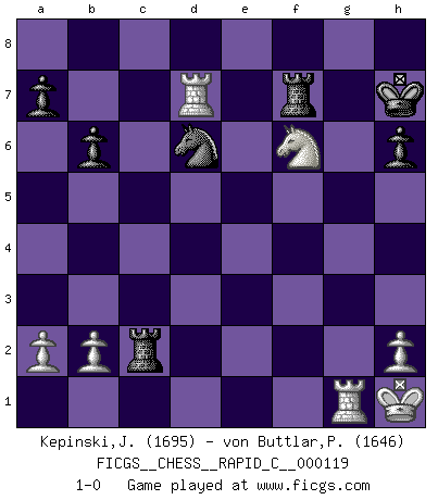 Last move : 1-0 2014 June 28 14:54:45 [Event "FICGS__CHESS__RAPID_C__000119"] [Site "FICGS"] [Date "2014.03.02"] [Round "1"] [White "Kepinski,Janusz"] [Black "von Buttlar,Paul"] [Result "1-0"] [WhiteElo "1695"] [BlackElo "1646"] 1.d4 d5 2.g3 Nf6 3.Bg2 c6 4.Nf3 Bf5 5.Nc3 Qc8 6.O-O Bh3 7.Bg5 Bxg2 8.Kxg2 Ne4 9.Qd3 f5 10.Qe3 h6 11.Bf4 Nd7 12.Be5 Ndf6 13.Bxf6 gxf6 14.Nh4 Qd7 15.Na4 b6 16.f3 Nd6 17.Ng6 Rh7 18.Nxf8 Kxf8 19.Rfe1 Re8 20.Rad1 e5 21.Kh1 f4 22.gxf4 Nf5 23.Qa3+ Qe7 24.Qd3 e4 25.fxe4 Qxe4+ 26.Qxe4 Rxe4 27.Nc3 Rxf4 28.e4 dxe4 29.d5 cxd5 30.Nxd5 Rf2 31.Nxf6 Rf7 32.Nxe4 Rxc2 33.Rd8+ Kg7 34.Rg1+ Kh7 35.Rd7 Nd6 36.Nf6+ 1-0 Queen's pawn game Kingside Castling by player White (move 6) Player White won this chess game. Follow this game move after move (download)Look at Garry Kasparov. After he loses, invariably he wins the next game. He just kills the next guy. That's something that we have to learn to be able to do. (Maurice Ashley) Du weisst es gibt ein Problem mit Computern und Fernschach, wenn jeder eine Rating von 2450 hat. (John Christen Knudsen) Debemos de asegurarnos de que el Ajedrez no se convierta en un lenguaje muerto, muy interesante, pero tan solo para un grupo muy pequeño. (Sytze Faber) Des combinaisons [dans le jeu d'échecs] pareilles à des mélodies. Je crois entendre pour ainsi dire la musique des coups... (Vladimir Nabokov) Waiting for chance ? Play in casinos. (FICGS proverb)