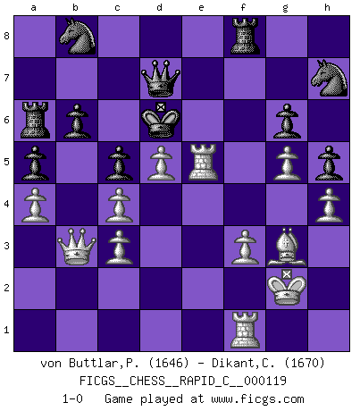 Last move : 1-0 2014 August 25 22:55:43 [Event "FICGS__CHESS__RAPID_C__000119"] [Site "FICGS"] [Date "2014.03.02"] [Round "1"] [White "von Buttlar,Paul"] [Black "Dikant,Christophe"] [Result "1-0"] [WhiteElo "1646"] [BlackElo "1670"] 1.c4 g6 2.d4 Bg7 3.Nc3 c5 4.d5 Bxc3+ 5.bxc3 f5 6.e4 fxe4 7.f3 e5 8.Qc2 d6 9.Be3 Bf5 10.g4 Bc8 11.Qxe4 Nd7 12.h4 Ngf6 13.Qc2 Rg8 14.Bd3 Qe7 15.Bg5 Qg7 16.Ne2 Nb6 17.Ng3 Bd7 18.a4 a5 19.Be3 Kd8 20.Qb2 Ra6 21.O-O Kc7 22.Rfb1 Rb8 23.Ra3 Bc8 24.Qa2 Nfd7 25.Ne4 h6 26.Qd2 h5 27.g5 Nf8 28.Qc2 Qd7 29.Bf1 Qf5 30.Qg2 Qf7 31.Qf2 Nbd7 32.Rab3 b6 33.Bh3 Qe7 34.Qe2 Qf7 35.Kg2 Nh7 36.Rf1 Qe8 37.Qc2 Ndf8 38.Bxc8 Qxc8 39.Bf2 Qd7 40.Rb5 Qf5 41.Bg3 Nd7 42.R5b1 Rf8 43.Qb3 Nb8 44.Rbe1 Qd7 45.Nxd6 Kxd6 46.Rxe5 1-0 English Opening Kingside Castling by player White (move 21) Player White won this chess game. Follow this game move after move (download)Later, I began to succeed in decisive games. Perhaps because I realized a very simple truth: not only was I worried, but also my opponent. (Mikhail Tal) Glücklicherweise sind Großmeister Ruben Fines reine Schachbücher weniger phallozentrisch [als seine Schachpsychologie] und deswegen auch weniger lächerlich. (Nigel Short) Si yo gano un torneo, yo lo gano por mí mismo. Yo hago las jugadas. Nadie me ayuda. (Bobby Fischer) La victoire dans une partie d'Echecs appartient la plupart du temps à celui qui voit un peu plus loin que l'adversaire. (Lasker) You lose, general Kenobi. (General Grievous in Star Wars ep.3)