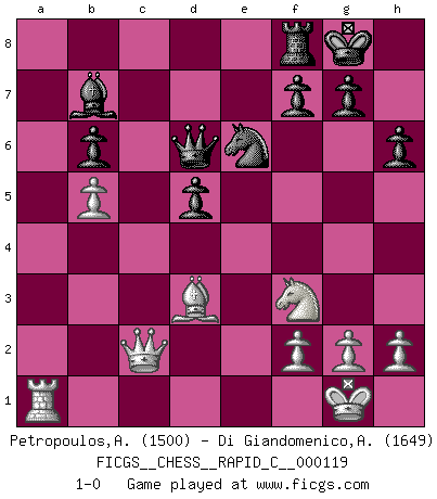 Last move : 1-0 2014 May 27 22:6:4 [Event "FICGS__CHESS__RAPID_C__000119"] [Site "FICGS"] [Date "2014.03.02"] [Round "1"] [White "Petropoulos,Athanasios"] [Black "Di Giandomenico,Alfonso"] [Result "1-0"] [WhiteElo "1500"] [BlackElo "1649"] 1.d4 Nf6 2.c4 e6 3.Nf3 b6 4.e3 Ba6 5.Be2 Nc6 6.O-O Be7 7.Qa4 Bb7 8.Nc3 O-O 9.d5 exd5 10.cxd5 Nb4 11.e4 a5 12.a3 Na6 13.Rd1 Nc5 14.Qc2 d6 15.Bf4 c6 16.e5 Nxd5 17.Nxd5 cxd5 18.b4 axb4 19.axb4 Rxa1 20.Rxa1 Ne6 21.exd6 Bxd6 22.Bxd6 Qxd6 23.Bd3 h6 24.b5 1-0 This chess game has been lost on time (started : 2014.03.02 16:5:0) Queen's Indian : 4.e3 Kingside Castling by player White (move 6) Kingside Castling by player Black (move 8) Player White won this chess game. Follow this game move after move (download)If your opponent offers you a draw, try to work out why he thinks he's worse off. (Nigel Short) Um sich vor der Gefahr einer Erkältung zu schützen, sorge der wanderlustige König beizeiten für ein brauchbares Versteck. (Aaron Nimzowitsch) Tu cuerpo tiene que estar en óptima condición. Tu Ajedrez se deteriora como lo hace tu cuerpo. No puedes separar la mente y el cuerpo. (Bobby Fischer) L'action d'une oeuvre littéraire se déroule sur un champ de bataille. Les masques et les types du drame moderne correspondent aux pièces du jeu d'échecs. L'intrigue correspond aux coups et aux gambits, c'est à dire aux techniques du jeu telles qu'utilisées et interprétées par les joueurs. Les tactiques et les péripéties [mouvements] correspondent aux coups exécutés par l'adversaire. (Viktor Shklovsky) There are three kinds of lies: lies, damned lies and statistics. (Mark Twain)