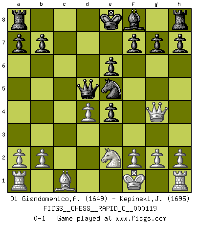 Last move : 0-1 2014 May 27 10:4:59 [Event "FICGS__CHESS__RAPID_C__000119"] [Site "FICGS"] [Date "2014.03.02"] [Round "1"] [White "Di Giandomenico,Alfonso"] [Black "Kepinski,Janusz"] [Result "0-1"] [WhiteElo "1649"] [BlackElo "1695"] 1.e4 e6 2.d4 d5 3.Nd2 Nf6 4.e5 Ne4 5.Nxe4 dxe4 6.c3 c5 7.Bb5+ Bd7 8.Bxd7+ Nxd7 9.Qg4 cxd4 10.cxd4 Qa5+ 11.Kf1 Qd5 12.Ne2 Nxe5 0-1 This chess game has been lost on time (started : 2014.03.02 16:5:0) French : Tarrasch, Closed variation Player Black won this chess game. Follow this game move after move (download)Chess is a terrible game. If you have no center, your opponent has a freer position. If you do have a center, then you really have something to worry about ! (Siegbert Tarrasch) Rubinstein ist ein Turmendspiel, welches die Götter vor tausenden von Jahren begannen. (Savielly Grigorievitsch Tartakower) Cuando veas una buena jugada, trata de encontrar otra mejor. (Emanuel Lasker) Vous n'êtes pas toujours obligé de jouer le meilleur coup. Un coup doit être actif, entreprenant, correct et beau ! (David Bronstein) When you've done things right people won't know you've done anything at all. (Futurama)