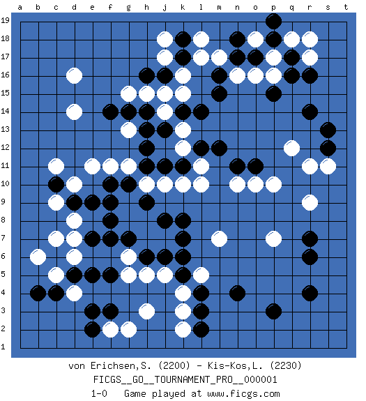 Last move : 1-0 2007 March 26 7:59:28 [Event "FICGS__GO__TOURNAMENT_PRO__000001"] [Site "FICGS"] [Date "2007.02.13"] [Round "1"] [Black "von Erichsen,Svante Carl"] [White "Kis-Kos,Laszlo"] [Result "1-0"] [Rating 1 "2200"] [Rating 2 "2230"] 1.q16 d4 2.p3 d16 3.f3 h3 4.f5 d6 5.l3 h5 6.f7 d8 7.f9 g8 8.e7 d7 9.e9 d10 10.j8 l5 11.n4 g9 12.h6 g6 13.g7 g5 14.e5 h7 15.j6 j7 16.k7 h8 17.k5 k4 18.l4 j5 19.k6 k3 20.l2 f2 21.e2 g2 22.e3 k2 23.k8 f11 24.g10 h10 25.h11 g11 26.f10 j10 27.h12 e11 28.k11 k10 29.h9 l11 30.j11 l10 31.f8 k13 32.h14 g13 33.d9 c9 34.c10 c11 35.l12 k12 36.h13 k15 37.h16 j17 38.j16 k16 39.k17 l17 40.k18 j18 41.m12 n10 42.m15 l18 43.n11 o10 44.o11 p10 45.k14 j14 46.l14 j15 47.j13 h15 48.g14 g15 49.f14 d14 50.r7 q12 51.r14 r9 52.s12 s11 53.s13 r11 54.r4 p7 55.r6 m7 56.d5 c5 57.c6 c7 58.c4 b6 59.b4 r17 60.q17 q18 61.p18 r18 62.r16 o18 63.p19 p17 64.o17 p16 65.n18 o16 66.n17 n16 67.m16 m17 68.p15 1-0 Here are the names of the openings (joseki) played in the four corners : Corner d4 : d4 f3 Hoshi (Hwajeom, Seongjeom, Xingwei`) 4-4 Point. The star or hoshi (4-4) point, emphasizing influence at the potential expense of territory. Ikken Kakari (Hankan Keolch'im, Yi Gua`jiao~, 1-Space Low Approach). Black 2 is the standard approach move to the 4-4. Corner q16 : q16 l11 Hoshi (Hwajeom, Seongjeom, Xingwei`) 4-4 Point. The star or hoshi (4-4) point, emphasizing influence at the potential expense of territory. Player Black won this Go (weiqi, baduk) game. Follow this game move after move (download)A basic: Don't push too hard. (Jansteen) Whoever said the pen is mightier than the sword obviously never encountered automatic weapons. (US General Douglas MacArthur)