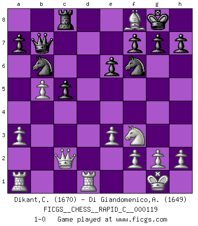 Last move : 1-0 2014 June 13 10:53:45 [Event "FICGS__CHESS__RAPID_C__000119"] [Site "FICGS"] [Date "2014.03.02"] [Round "1"] [White "Dikant,Christophe"] [Black "Di Giandomenico,Alfonso"] [Result "1-0"] [WhiteElo "1670"] [BlackElo "1649"] 1.d4 Nf6 2.Nf3 e6 3.e3 b6 4.b3 Ba6 5.c4 d5 6.Nbd2 Be7 7.Bb2 O-O 8.Qc2 Nc6 9.a3 dxc4 10.Bxc4 Bxc4 11.Nxc4 Nb8 12.O-O Nbd7 13.b4 c5 14.dxc5 bxc5 15.b5 Nb6 16.Rfd1 Qc7 17.Be5 Qb7 18.Nd6 Bxd6 19.Bxd6 Rac8 20.Bxf8 1-0 Queen's pawn : Yusupov-Rubinstein system Kingside Castling by player Black (move 7) Kingside Castling by player White (move 12) Player White won this chess game. Follow this game move after move (download)A strong memory, concentration, imagination, and a strong will is required to become a great Chess player. (Bobby Fischer) Ja, jede Frau in Holland liebt mich bestimmt, und alle Männer hassen mich. (Loek van Wely) Debió haber existido una vez en que los hombres eran semidióses, de otra manera no hubiesen podido inventar el Ajedrez. (Gustav Schenk) Mais n'est-ce pas déjà le limiter injurieusement que d'appeler les échecs un jeu? N'est-ce pas aussi une science, un art, ou quelque chose qui, comme le cercueil de Mahomet entre ciel et terre, est suspendu entre l'un et l'autre, et qui réunit un nombre incroyable de contraires ? (Stefan Zweig) I don't diet. I just don't eat as much as I'd like to. (Linda Evangelista, supermodel)