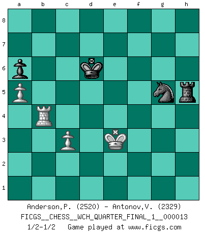 Last move : 1/2-1/2 2014 May 20 19:50:8 [Event "FICGS__CHESS__WCH_QUARTER_FINAL_1__000013"] [Site "FICGS"] [Date "2014.03.02"] [Round "7"] [White "Anderson,Peter W."] [Black "Antonov,Vladimir"] [Result "1/2-1/2"] [WhiteElo "2520"] [BlackElo "2329"] 1.d4 d5 2.c4 c6 3.Nf3 Nf6 4.Nc3 e6 5.Bg5 h6 6.Bh4 dxc4 7.e4 g5 8.Bg3 b5 9.e5 Nd5 10.Nd2 Bb7 11.h4 Nxc3 12.bxc3 c5 13.a4 a6 14.dxc5 Nd7 15.hxg5 Nxc5 16.Bf4 h5 17.Qb1 Bc6 18.Rh3 Be7 19.g6 fxg6 20.Qxg6+ Kd7 21.Nxc4 bxc4 22.Rd1+ Bd5 23.Bxc4 Qg8 24.Bxd5 exd5 25.Qf5+ Qe6 26.Rxd5+ Ke8 27.Qxe6 Nxe6 28.Be3 Rc8 29.Kd2 Rc4 30.Ra5 Rc6 31.Rd5 Bc5 32.Bxc5 Nxc5 33.f4 Ne6 34.g3 Kf7 35.Rh4 Kg6 36.f5+ Kxf5 37.g4+ Ke4 38.Rd6 Rxd6+ 39.exd6 Rh7 40.a5 Ng5 41.gxh5 Ke5 42.Ke3 Kxd6 43.Rb4 Rxh5 1/2-1/2 QGD Slav : 4.Nc3 10 pieces endgame at move 41 : White KRPPPP , Black KRNP WHITE : King + 1 Rook 4 Pawns BLACK : King + 1 Rook 1 Knight 1 Pawn 9 pieces endgame at move 42 : White KRPPP , Black KRNP WHITE : King + 1 Rook 3 Pawns BLACK : King + 1 Rook 1 Knight 1 Pawn 8 pieces endgame at move 43 : White KRPP , Black KRNP WHITE : King + 1 Rook 2 Pawns BLACK : King + 1 Rook 1 Knight 1 Pawn This chess game ended in a draw. Follow this game move after move (download)In Chess, as it is played by masters, chance is practically eliminated. (Emanuel Lasker) In Buenos Aires ist es nicht mein vorrangiges Ziel ein starkes Turnier zu organisieren, sondern ein Turnier für Gentlemen. Ich würde nie Kamsky einladen. Ich mag keine Probleme. (Miguel Najdorf) Nada excita más a Grandes Maestros aburridos que una novedad teórica. (Dominic Lawson) Votre prénom est 'Tactique', votre deuxième prénom est 'Tactique' et votre nom est 'Tactique'. (Ken Smith) He is a liar. I just don't know what the lie is yet. (Horatio Caine, C.S.I. Miami)