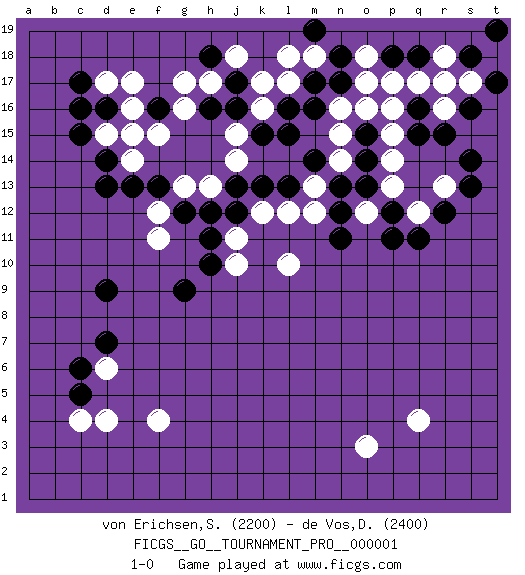 Last move : 1-0 2007 February 25 20:27:20 [Event "FICGS__GO__TOURNAMENT_PRO__000001"] [Site "FICGS"] [Date "2007.02.13"] [Round "1"] [Black "von Erichsen,Svante Carl"] [White "de Vos,Dave"] [Result "1-0"] [Rating 1 "2200"] [Rating 2 "2400"] 1.r15 d4 2.c15 q4 3.c6 f4 4.d9 q17 5.n17 p16 6.r12 r16 7.q15 d17 8.q16 o17 9.r17 r18 10.s16 n16 11.f16 d15 12.d16 e16 13.c16 e17 14.e15 f15 15.d14 e14 16.e13 d15 17.c17 e15 18.d13 d6 19.c5 c4 20.d7 o3 21.j16 j14 22.l15 l17 23.l16 k17 24.j17 j18 25.h18 k16 26.k15 j15 27.m17 m18 28.n18 l18 29.m16 h17 30.h16 g17 31.o15 p15 32.o14 p14 33.o13 s17 34.p18 o18 35.m19 g16 36.q18 p17 37.s18 r16 38.t17 r17 39.s14 t18 40.t19 r13 41.s13 n15 42.m14 p13 43.p12 q12 44.q11 n14 45.n13 o12 46.p11 m13 47.n12 m12 48.n11 o16 49.l13 l12 50.k13 k12 51.j13 g13 52.j12 j11 53.h11 j10 54.g12 f12 55.f13 h13 56.h12 f11 57.h10 l10 58.g9 1-0 Comment by player 2 : Dave de Vos : Thank you :) Here are the names of the openings (joseki) played in the four corners : Corner d4 : d4 c6 Hoshi (Hwajeom, Seongjeom, Xingwei`) 4-4 Point. The star or hoshi (4-4) point, emphasizing influence at the potential expense of territory. Ikken Kakari (Hankan Keolch'im, Yi Gua`jiao~, 1-Space Low Approach). Black 2 is the standard approach move to the 4-4. Corner q16 : r15 q17 Mokuhazushi (Waemok, Wai`mu`) 5-3 Point. The mokuhazushi (5-3) point was popular in the Edo period in Japan (1600 - 1867). It emphasizes influence; territorially, it is inferior to the 3-4 point. Komoku Kakari. White 2 is the standard approach because of its solidity and stability. Corner d16 : c15 d17 Mokuhazushi (Waemok, Wai`mu`) 5-3 Point. The mokuhazushi (5-3) point was popular in the Edo period in Japan (1600 - 1867). It emphasizes influence; territorially, it is inferior to the 3-4 point. Komoku Kakari. White 2 is the standard approach because of its solidity and stability. Player Black won this Go (weiqi, baduk) game. Follow this game move after move (download)Don't make empty triangles. (Anonymous) Inventor: A person who makes an ingenious arrangement of wheels, levers and springs, and believes it civilization. (Ambrose Bierce, The Devil's Dictionary)