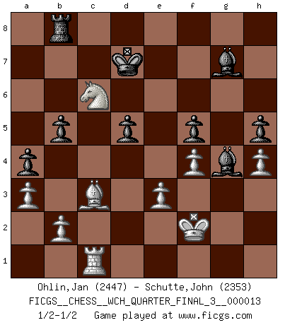 Last move : 1/2-1/2 2014 May 21 20:56:23 [Event "FICGS__CHESS__WCH_QUARTER_FINAL_3__000013"] [Site "FICGS"] [Date "2014.03.02"] [Round "5"] [White "Ohlin,Jan"] [Black "Schutte,John"] [Result "1/2-1/2"] [WhiteElo "2447"] [BlackElo "2353"] 1.Nf3 d5 2.d4 Nf6 3.c4 c6 4.Nbd2 Bf5 5.Nh4 Be6 6.e3 g5 7.Nhf3 g4 8.Ne5 h5 9.cxd5 Qxd5 10.f3 Nbd7 11.Bc4 Qd6 12.Nxd7 Qxd7 13.Qb3 Nd5 14.Ne4 b5 15.Bf1 Bh6 16.Qd3 Nb4 17.Qb1 Bf5 18.Bd2 a5 19.a3 Nd5 20.Qc1 gxf3 21.gxf3 Qe6 22.Nc5 Qf6 23.h4 Bd7 24.Kf2 Rg8 25.Bd3 e5 26.dxe5 Qxe5 27.f4 Qg7 28.Rg1 Qxg1+ 29.Qxg1 Rxg1 30.Rxg1 Bg4 31.Be2 f5 32.Bf3 Ke7 33.Bxd5 cxd5 34.Bc3 Kf7 35.Nd7 a4 36.Ne5+ Ke6 37.Nc6 Kd7 38.Nd4 Rb8 39.Rc1 Bg7 40.Nc6 1/2-1/2 Reti Opening This chess game ended in a draw. Follow this game move after move (download)Checkers is for tramps. (Paul Morphy) Wenn Capablanka heute auf der Schachbühne erscheinen würde, hätte er ein halbes Jahr gebraucht um sich die Schachtheorie anzueignen. Und dann hätte er alles und jeden besiegt. (Mikhail Moiseyevich Botvinik) La vida es como un juego de Ajedrez, cambiando con cada movimiento. (Proverbio Chino) Un footballeur joue avec ses pieds, parfois avec sa tête. Un joueur d'échecs ne joue qu'avec sa tête. Et quand il ne joue plus, il meurt. (Jacob Murray) In every real man a child is hidden that wants to play. (Friedrich Nietzsche)