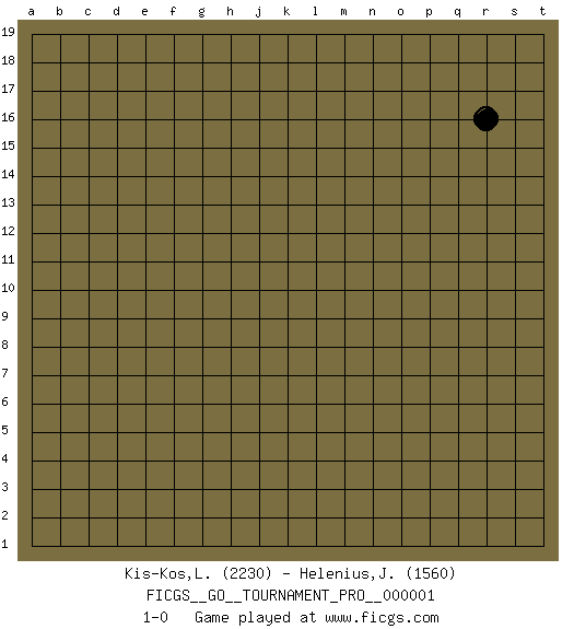 Last move : 1-0 2007 March 15 13:56:24 [Event "FICGS__GO__TOURNAMENT_PRO__000001"] [Site "FICGS"] [Date "2007.02.13"] [Round "1"] [Black "Kis-Kos,Laszlo"] [White "Helenius,Jan-Krister"] [Result "1-0"] [Rating 1 "2230"] [Rating 2 "1560"] 1.r16 1-0 This go game has been lost on time (started : 2007.02.13 12:57:1) Here are the names of the openings (joseki) played in the four corners : Player Black won this Go (weiqi, baduk) game. Follow this game move after move (download)More haste less speed. (John Fairbairn) The difference between perseverance and obstinacy is that one comes from a strong will, and the other from a strong won't. (Henry Ward Beecher)