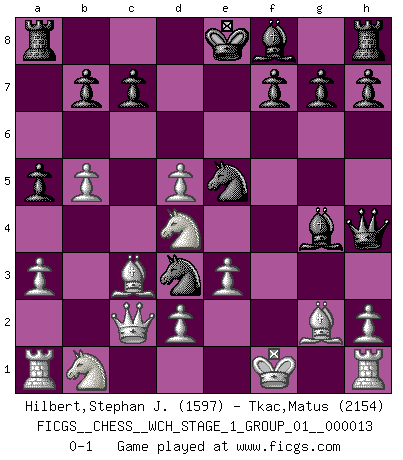 Last move : 0-1 2014 March 21 21:11:48 [Event "FICGS__CHESS__WCH_STAGE_1_GROUP_01__000013"] [Site "FICGS"] [Date "2014.03.03"] [Round "1"] [White "Hilbert,Stephan J."] [Black "Tkac,Matus"] [Result "0-1"] [WhiteElo "1597"] [BlackElo "2154"] 1.b4 d5 2.Bb2 Nf6 3.e3 e5 4.a3 Nbd7 5.Nf3 e4 6.Nd4 a5 7.b5 Nc5 8.c4 Nfd7 9.cxd5 Ne5 10.Bc3 Bg4 11.f3 exf3 12.Qc2 fxg2 13.Bxg2 Qh4+ 14.Kf1 Ncd3 0-1 Polish (Sokolsky) opening Player Black won this chess game. Follow this game move after move (download)When you don't know what to play, wait for an idea to come into your opponent's mind. You may be sure that idea will be wrong. (Siegbert Tarrasch) Es gibt nur zwei wahre Schachgenies - das andere war Wilhelm Steinitz, der Weltmeister von 1872 bis 1894. (Robert James Fischer) Hasta este punto, las blancas han seguido un análisis bien conocido. Pero ahora el hace un error fatal: empieza a usar su propia cabeza. (Siegbert Tarrasch) Le pion, dans sa simplicité, marche droit devant lui, mais lorsqu'il prend, il le fait obliquement? Ainsi l'homme, tant qu'il reste pauvre, marche dans la droiture et vit honnêtement, mais lorsqu'il recherche les honneurs, il flatte, se parjure et, par les voies obliques, cherche une position supérieure sur l'échiquier du monde. (Jean de Galles) Art is the triumph over chaos. (John Cheever)