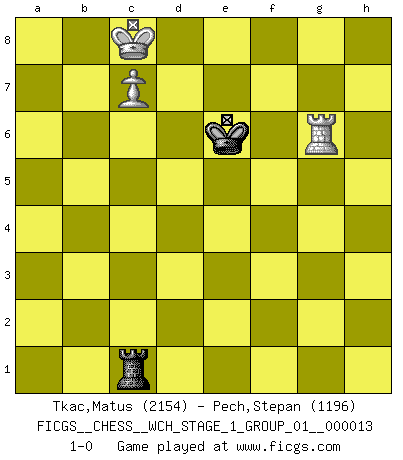 Last move : 1-0 2014 October 7 19:16:53 [Event "FICGS__CHESS__WCH_STAGE_1_GROUP_01__000013"] [Site "FICGS"] [Date "2014.03.03"] [Round "1"] [White "Tkac,Matus"] [Black "Pech,Stepan"] [Result "1-0"] [WhiteElo "2154"] [BlackElo "1196"] 1.e4 c5 2.Nf3 Nc6 3.Bb5 e6 4.Bxc6 bxc6 5.d3 Ne7 6.Qe2 Ng6 7.h4 h5 8.e5 f6 9.Nbd2 Be7 10.Qe4 Kf7 11.g4 hxg4 12.Qxg4 Nxe5 13.Nxe5+ fxe5 14.h5 Qf8 15.Nc4 d6 16.Qg6+ Kg8 17.h6 Qf7 18.h7+ Kf8 19.Qg2 e4 20.Bg5 e5 21.O-O-O Be6 22.Bxe7+ Kxe7 23.Na5 Kd7 24.dxe4 Kc7 25.f3 Rad8 26.Qf2 Rdf8 27.Qf1 c4 28.Qg1 c5 29.Rh2 c3 30.bxc3 Qxf3 31.Kb2 Rb8+ 32.Nb3 Qf8 33.Rhd2 Rb6 34.Rxd6 Rxd6 35.Qxc5+ Kd7 36.Qxa7+ Ke8 37.Qb8+ Kf7 38.Qxf8+ Kxf8 39.Rxd6 Ke7 40.Rb6 Rxh7 41.a4 Rh8 42.Nc5 Bh3 43.a5 g5 44.Nd3 Ra8 45.Rb5 Be6 46.Rxe5 Kf6 47.Rc5 g4 48.Nf4 Bg8 49.c4 Bh7 50.Nh5+ Kf7 51.Ng3 Bg8 52.Kc3 Ke7 53.Nh5 Bf7 54.Nf4 g3 55.Rg5 Kd8 56.Kd4 Ra6 57.Rxg3 Rxa5 58.e5 Bxc4 59.Kxc4 Ra4+ 60.Kb5 Rxf4 61.c4 Re4 62.c5 Re1 63.Kc6 Rc1 64.e6 Re1 65.e7+ Kxe7 66.Kc7 Ke6 67.c6 Re2 68.Kc8 Rc2 69.c7 Rc1 70.Rg6+ 1-0 Sicilian : Nimzovich-Rossolimo attack (without ...d6) Queenside Castling by player White (move 21) 10 pieces endgame at move 57 : White KRNPPPP , Black KRB WHITE : King + 1 Rook 1 Knight 4 Pawns BLACK : King + 1 Rook 1 Bishop 9 pieces endgame at move 57 : White KRNPPP , Black KRB WHITE : King + 1 Rook 1 Knight 3 Pawns BLACK : King + 1 Rook 1 Bishop 8 pieces endgame at move 58 : White KRNPP , Black KRB WHITE : King + 1 Rook 1 Knight 2 Pawns BLACK : King + 1 Rook 1 Bishop 7 pieces endgame at move 59 : White KRNPP , Black KR WHITE : King + 1 Rook 1 Knight 2 Pawns BLACK : King + 1 Rook 6 pieces endgame at move 60 : White KRPP , Black KR WHITE : King + 1 Rook 2 Pawns BLACK : King + 1 Rook 5 pieces endgame at move 65 : White KRP , Black KR WHITE : King + 1 Rook 1 Pawn BLACK : King + 1 Rook Player White won this chess game. Follow this game move after move (download)My God, Bobby Fischer plays so simply. (Alexei Suetin) Ich hatte meine größten Erfolge, als ich 47 Jahre alt war. Kasparow war noch nicht mal 42 und hat das Schach schon im Stich gelassen. (Viktor Kortschnoi) Fischer deseaba darle a los Rusos una sopa de su propia medicina. (Larry Evans) Donnez-moi un Cavalier en 6e et je gagnerais toutes mes parties. (Steinitz) The faster the computer, the slower the brain. (Thibault de Vassal)