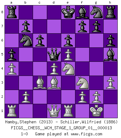 Last move : 1-0 2014 May 18 19:52:24 [Event "FICGS__CHESS__WCH_STAGE_1_GROUP_01__000013"] [Site "FICGS"] [Date "2014.03.03"] [Round "1"] [White "Hamby,Stephen"] [Black "Schiller,Wilfried"] [Result "1-0"] [WhiteElo "2013"] [BlackElo "1886"] 1.d4 d5 2.c4 c6 3.Nc3 Nf6 4.Nf3 dxc4 5.a4 Bf5 6.e3 e6 7.Bxc4 Nbd7 8.O-O Bg6 9.Bd3 Bh5 10.e4 a5 11.e5 Ng8 12.Ne4 Nb6 13.Bg5 Qd5 14.Qe2 h6 15.Bd2 Qd8 16.Qd1 Qd5 17.h3 Qd8 18.Bc3 Qd5 19.Re1 1-0 QGD Slav defense Kingside Castling by player White (move 8) Player White won this chess game. Follow this game move after move (download)Only sissies Castle. (Rob Sillars) Über Kasparov: Es ist offensichtlich, daß er in einem totalitären Staat aufwuchs und deshalb zu diktatorischen Zügen neigt. (Viktor Kortschnoi) La enorme capacidad mental, en la que sin ella no puede un jugador de Ajedrez existir, es demasiado requerida por el Ajedrez al grado de que nunca podrá liberar su mente de este juego. (Albert Einstein) Horreur, mais aussi harmonie suprême : qu'y avait-il en effet au monde en dehors des échecs ? Le brouillard, l'inconnu, le non-être... (Vladimir Nabokov) Lamb in skin of tiger, still fears the wolf. (Chinese proverb)