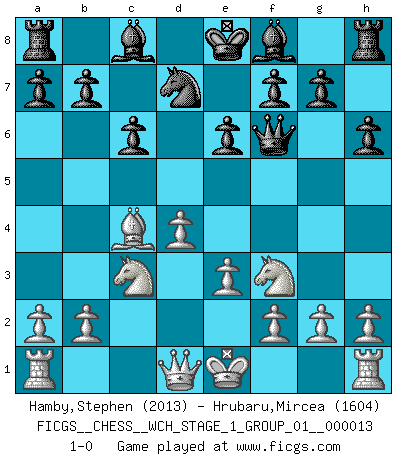 Last move : 1-0 2014 May 2 20:53:36 [Event "FICGS__CHESS__WCH_STAGE_1_GROUP_01__000013"] [Site "FICGS"] [Date "2014.03.03"] [Round "1"] [White "Hamby,Stephen"] [Black "Hrubaru,Mircea"] [Result "1-0"] [WhiteElo "2013"] [BlackElo "1604"] 1.c4 Nf6 2.d4 e6 3.Nc3 d5 4.Nf3 c6 5.Bg5 h6 6.Bxf6 Qxf6 7.e3 Nd7 8.Bd3 dxc4 9.Bxc4 1-0 This chess game has been lost on time (started : 2014.03.03 0:2:39) English, 1...Nf6 (Anglo-Indian defense) Player White won this chess game. Follow this game move after move (download)Excellence at Chess is one mark of a scheming mind. (Sir Arthur Conan Doyle) Das Schachspiel hat wie die Liebe, die Musik, die Fähigkeit, den Menschen glücklich zu machen. Ich habe ein leises Gefühl des Bedauerns für jeden, der das Schachspiel nicht kennt, so wie ich jeden bedaure, der die Liebe nicht kennt. (Siegbert Tarrasch) Si un gobernante no entiende al Ajedrez, ¿como puede governar él un reinado?. (El Rey Khusros II) Tous ces prétendus hommes politiques sont les pions, les Cavaliers, les Tours ou les Fous d'une partie d'échecs qui se jouera tant qu'un hasard ne renversera pas l'échiquier. (Honoré de Balzac) He who defends everything defends nothing. (Frederick the Great)
