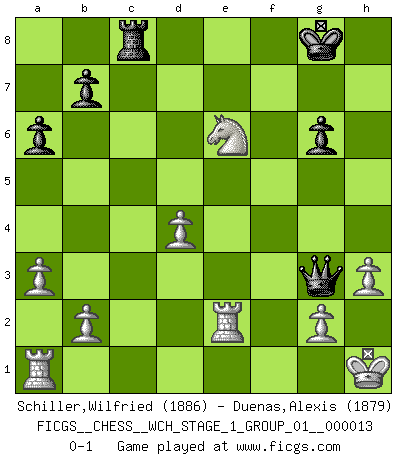 Last move : 0-1 2014 May 18 19:52:33 [Event "FICGS__CHESS__WCH_STAGE_1_GROUP_01__000013"] [Site "FICGS"] [Date "2014.03.03"] [Round "1"] [White "Schiller,Wilfried"] [Black "Duenas,Alexis"] [Result "0-1"] [WhiteElo "1886"] [BlackElo "1879"] 1.e4 e5 2.Nf3 Nc6 3.Bc4 Bc5 4.c3 Nf6 5.d3 d6 6.Nbd2 O-O 7.h3 a6 8.Bb3 Ba7 9.Nf1 d5 10.Qc2 Na5 11.Ng3 c5 12.Qe2 h6 13.O-O Re8 14.Bxd5 Nxd5 15.exd5 Qxd5 16.Nh4 Nc6 17.Re1 Qe6 18.Qh5 Bb8 19.Ne4 Ne7 20.Nxc5 Qc6 21.Ne4 Rd8 22.Bg5 hxg5 23.Nxg5 Ng6 24.f4 Qf6 25.fxe5 Nxe5 26.Qh7+ Kf8 27.Nxf7 Nf3+ 28.Nxf3 Bf5 29.Qxf5 Qxf5 30.Nxd8 Ba7+ 31.Nd4 Kg8 32.N8e6 Qxd3 33.Kh1 Re8 34.a3 g6 35.Re5 Qg3 36.Re2 Bxd4 37.cxd4 Rc8 0-1 Giuoco Piano Kingside Castling by player Black (move 6) Kingside Castling by player White (move 13) Player Black won this chess game. Follow this game move after move (download)Whoever sees no other aim in the game than that of giving checkmate to one's opponent will never become a good Chess player. (Euwe) Korrekt heißt in Deutschland die Haltung eines Mannes, dessen Benehmen nach dem Urteile seiner Nachbarn seiner Stellung angemessen ist. Um korrekt zu sein, muß man sich der Meinung der anderen anpassen... (Emanuel Lasker) Con o sin el título, Bobby Fischer fue sin lugar a dudas el mas grande jugador de su época. (Burt Hochberg) Il s'avisa de me proposer d'apprendre les échecs qu'il jouait un peu... me voilà forcené des échecs. J'achète un échiquier, je m'enferme dans ma chambre, j'y passe des jours et des nuits à vouloir apprendre par cur toutes les parties. (Jean-Jacques Rousseau, Confessions) Who needs drugs and alcohol if he can play Big Chess at FICGS ? (Heinz-Georg Lehnhoff)