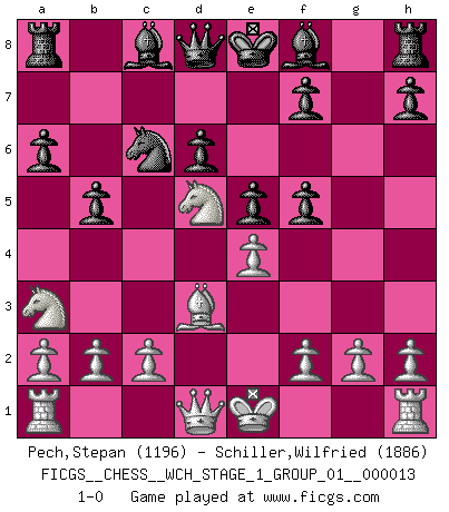 Last move : 1-0 2014 May 18 19:52:41 [Event "FICGS__CHESS__WCH_STAGE_1_GROUP_01__000013"] [Site "FICGS"] [Date "2014.03.03"] [Round "1"] [White "Pech,Stepan"] [Black "Schiller,Wilfried"] [Result "1-0"] [WhiteElo "1196"] [BlackElo "1886"] 1.e4 c5 2.Nf3 Nc6 3.d4 cxd4 4.Nxd4 Nf6 5.Nc3 e5 6.Ndb5 d6 7.Bg5 a6 8.Na3 b5 9.Bxf6 gxf6 10.Nd5 f5 11.Bd3 1-0 Sicilian : Pelikan (Lasker/Sveshnikov) variation Player White won this chess game. Follow this game move after move (download)A bad day of Chess is better than any good day at work. (Anonymous) Frage des Reporters: -Worin besteht das Ziel von Gambiteröffnungen? Antwort: -Auf Kosten der Partie einen Ruf als Angriffspieler zu erwerben.- (Siegbert Tarrasch) Cada Peón es una Reina en potencia. (James Mason) Karpov est une pièce de musée. (Garry Kasparov) I couldn't make any sense out of what this particular thread is about. It sounds like R2 D2 computer speaking. A space fight ?!? Some 'command' problems in Moscow ? Some killers & narcotic addicts attacking some game & a god wannabe ?? (Dinesh De Silva, lost in a russian conflict in FICGS forum)
