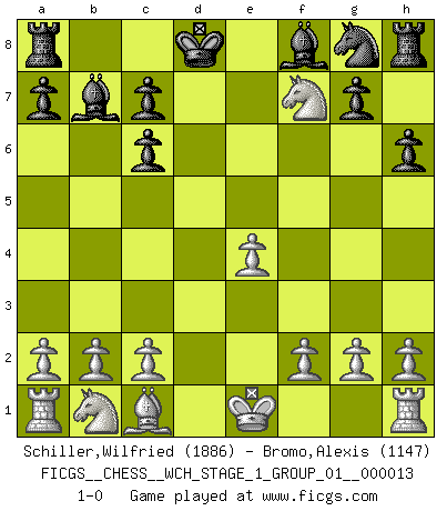 Last move : 1-0 2014 March 4 19:51:36 [Event "FICGS__CHESS__WCH_STAGE_1_GROUP_01__000013"] [Site "FICGS"] [Date "2014.03.03"] [Round "1"] [White "Schiller,Wilfried"] [Black "Bromo,Alexis"] [Result "1-0"] [WhiteElo "1886"] [BlackElo "1147"] 1.e4 e5 2.Nf3 Nc6 3.Bb5 d6 4.d4 h6 5.dxe5 dxe5 6.Qxd8+ Kxd8 7.Bxc6 bxc6 8.Nxe5 Bb7 9.Nxf7+ 1-0 Ruy Lopez : Old Steinitz defense Player White won this chess game. Follow this game move after move (download)The Pin is mightier than the sword. (Fred Reinfeld) Wer nie einen Fehler gemacht hat, hat nie etwas Neues ausprobiert. (Albert Einstein) En partidas rápidas, el Caballo es mas poderoso que el Alfil. (Vlastimil Hort) Il n'y a pas de prix trop élevé au scalp de l'ennemi. (Koblentz) I teach you to lie, cheat and steal, and as soon as my back's turned you wait in line ? (Gregory House, House M.D.)