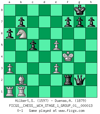 Last move : 0-1 2014 March 21 21:30:48 [Event "FICGS__CHESS__WCH_STAGE_1_GROUP_01__000013"] [Site "FICGS"] [Date "2014.03.03"] [Round "1"] [White "Hilbert,Stephan J."] [Black "Duenas,Alexis"] [Result "0-1"] [WhiteElo "1597"] [BlackElo "1879"] 1.b4 e5 2.Bb2 Bxb4 3.Bxe5 Nf6 4.c4 O-O 5.a3 Be7 6.Nf3 Nc6 7.Bb2 d5 8.cxd5 Qxd5 9.Nc3 Qa5 10.e3 Ne5 11.Nxe5 Qxe5 12.Be2 Bf5 13.O-O Rad8 14.d4 Qa5 15.Qb3 Be6 16.Bc4 Bxc4 17.Qxc4 Rd7 18.h3 Rfd8 19.Rfb1 Qf5 20.Qb5 c5 21.Na4 a6 22.Qa5 Rd6 23.Nb6 Ne4 24.f3 Rg6 25.fxe4 Qxh3 26.Qd2 Bd6 27.e5 Bxe5 28.Qf2 Qh2+ 29.Kf1 Rf6 30.dxe5 Rxf2+ 31.Kxf2 Rd2+ 32.Kf3 Qxg2+ 33.Kf4 Rf2+ 0-1 Polish (Sokolsky) opening Kingside Castling by player Black (move 4) Kingside Castling by player White (move 13) Player Black won this chess game. Follow this game move after move (download)It is always better to sacrifice your opponent's men. (Savielly Tartakower) Die Elozahlen sind sehr schlecht für das Schach. Jetzt ist Schach eine Sportindustrie, die darauf zielt Elopunkte zu machen. (Miguel Najdorf) En la perfecta combinación de Ajedrez como en una historia corta de primera clase, toda la trama y contra trama deberá conducir hacia un final sorprendente, el interes no es mitigado hasta el último momento. (Yates and Winter) Les Cavaliers se révèlent fort utiles dans les positions fermées. D'habitude, les Fous sont un peu plus forts que les Cavaliers dans les positions ouvertes. Qu'on le veuille ou non, il restera toujours des exceptions ! The worth of a book is to be measured by what you can carry away from it. (James Bryce)