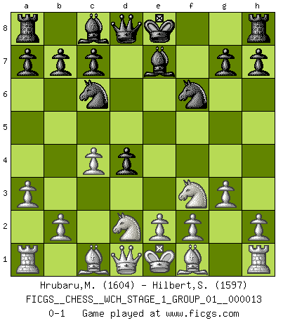 Last move : 0-1 2014 April 23 20:18:35 [Event "FICGS__CHESS__WCH_STAGE_1_GROUP_01__000013"] [Site "FICGS"] [Date "2014.03.03"] [Round "1"] [White "Hrubaru,Mircea"] [Black "Hilbert,Stephan J."] [Result "0-1"] [WhiteElo "1604"] [BlackElo "1597"] 1.d4 d5 2.c4 e5 3.dxe5 d4 4.Nf3 Nc6 5.g3 Bb4+ 6.Nbd2 f6 7.exf6 Nxf6 8.a3 Be7 0-1 This chess game has been lost on time (started : 2014.03.03 0:2:39) QGD : Albin counter-gambit, 5.g3 Player Black won this chess game. Follow this game move after move (download)If you aren't afraid of Spassky, then I have removed the element of money. (Jim Slater) Wenn Du einsam bist, wenn Du Dich in der Welt wie ein Fremder fühlst, spiele Schach. Das wird Deinen Geist erheben und Dein Ratgeber im Kampf sein. (Aristoteles) Por tratar de evitar la pérdida de una pieza, muchas personas han perdido una partida de Ajedrez. (Savielly Tartakover) On croit qu'il y a plus de mauvais joueurs que de bons joueurs, c'est faux : Il y a autant de joueurs qui gagnent que de joueurs qui perdent. (Philippe Geluck) O divine art of subtlety and secrecy! Through you we learn to be invisible, through you inaudible and hence we can hold the enemy's fate in our hands. (Sun Tzu)