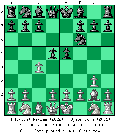 Last move : 0-1 2014 April 8 19:31:21 [Event "FICGS__CHESS__WCH_STAGE_1_GROUP_02__000013"] [Site "FICGS"] [Date "2014.03.03"] [Round "1"] [White "Hallqvist,Niklas"] [Black "Dyson,John"] [Result "0-1"] [WhiteElo "2022"] [BlackElo "2011"] 1.c4 e5 2.g3 Nf6 3.Bg2 d5 0-1 This chess game has been lost on time (started : 2014.03.03 0:6:0) English Opening Player Black won this chess game. Follow this game move after move (download)Fischer is completely natural. He plays no roles. He's like a child. Very, very simple. (Zita Rajcsanyi) Schach ist ein Reich, wo sich die menschliche Phantasie frei entfalten kann. (David Bronstein) Ciertamente el estado mental actual de Bobby Fischer es una tragedia. Uno de los mas grandes jugadores de Ajedrez del mundo -el orgullo y pena del Ajedrez Americano. (Frank Brady) La tactique, c'est ce que vous faites quand il y a quelque chose à faire; la stratégie, c'est ce que vous faites quand il n'y a rien à faire. (Savielli Tartacower) Every now and then a man's mind is stretched by a new idea and never shrinks back to its former dimensions. (Oliver Wendell Holmes, Sr.)