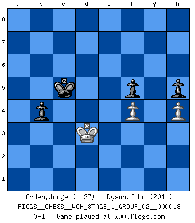 Last move : 0-1 2014 May 11 4:52:51 [Event "FICGS__CHESS__WCH_STAGE_1_GROUP_02__000013"] [Site "FICGS"] [Date "2014.03.03"] [Round "1"] [White "Orden,Jorge"] [Black "Dyson,John"] [Result "0-1"] [WhiteElo "1127"] [BlackElo "2011"] 1.e4 d6 2.d4 Nf6 3.Nc3 g6 4.Nf3 Bg7 5.Be2 O-O 6.O-O c6 7.h3 Nbd7 8.b4 e5 9.dxe5 Nxe5 10.Bb2 Nxe4 11.Nxe5 Nxc3 12.Bxc3 Bxe5 13.Bxe5 dxe5 14.Qxd8 Rxd8 15.Rfd1 Bf5 16.Bd3 Bxd3 17.Rxd3 Rxd3 18.cxd3 Rd8 19.Rd1 Rd4 20.a3 e4 21.Kf1 Rxd3 22.Rxd3 exd3 23.Ke1 a5 24.Kd2 axb4 25.axb4 Kf8 26.Kxd3 Ke7 27.Kd4 Kd6 28.f4 h5 29.g4 f5 30.gxf5 gxf5 31.h4 b5 32.Ke3 c5 33.bxc5+ Kxc5 34.Kd3 b4 0-1 Pirc : Classical system, 5.Be2 Kingside Castling by player Black (move 5) Kingside Castling by player White (move 6) 10 pieces endgame at move 30 : White KPPPP , Black KPPPP WHITE : King + 4 Pawns BLACK : King + 4 Pawns 9 pieces endgame at move 30 : White KPPP , Black KPPPP WHITE : King + 3 Pawns BLACK : King + 4 Pawns 8 pieces endgame at move 33 : White KPPP , Black KPPP WHITE : King + 3 Pawns BLACK : King + 3 Pawns 7 pieces endgame at move 33 : White KPP , Black KPPP WHITE : King + 2 Pawns BLACK : King + 3 Pawns Player Black won this chess game. Follow this game move after move (download)You are for me the Queen on d8 and I am the Pawn on d7 !! (Eduard Gufeld) Charakterschwächen offenbaren sich normalerweise während einer Schachpartie. (Garry Kasparov) El Ajedrez es un cuento de Hadas de las 1001 metidas de pata. (Savielly Tartakower) Mon pion favori sur ma case favorite ! Bronstein en parlant d'un coup de pion en h5 quand il avait les Noirs. I find your interest interesting. (Gregory House, House M.D.)