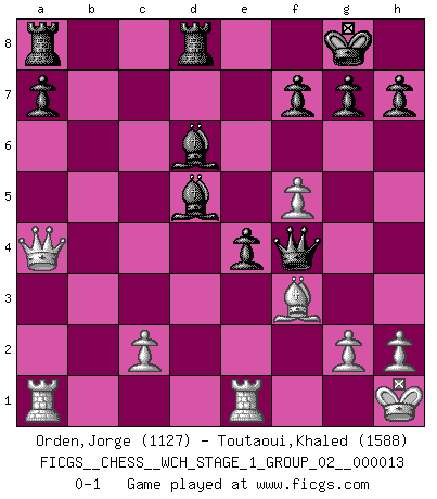 Last move : 0-1 2014 May 11 4:52:2 [Event "FICGS__CHESS__WCH_STAGE_1_GROUP_02__000013"] [Site "FICGS"] [Date "2014.03.03"] [Round "1"] [White "Orden,Jorge"] [Black "Toutaoui,Khaled"] [Result "0-1"] [WhiteElo "1127"] [BlackElo "1588"] 1.e4 c5 2.Nf3 Nc6 3.d4 cxd4 4.Nxd4 Nf6 5.Nc3 d6 6.Bb5 Bd7 7.O-O e6 8.Kh1 Be7 9.Nxc6 bxc6 10.Bd3 O-O 11.f4 Qc7 12.Qf3 e5 13.f5 d5 14.exd5 cxd5 15.Nxd5 Nxd5 16.Qxd5 Bc6 17.Qc4 Qb7 18.Rf2 e4 19.Be2 Rfd8 20.Be3 Qxb2 21.R2f1 Bd5 22.Qc7 Bd6 23.Qa5 Bb4 24.Qb5 Qc3 25.a3 Bxa3 26.Qa4 Qxe3 27.Rfe1 Bd6 28.Bf3 Qf4 0-1 Sicilian defense Kingside Castling by player White (move 7) Kingside Castling by player Black (move 10) Player Black won this chess game. Follow this game move after move (download)Chess is a part of culture and if a culture is declining then Chess too will decline. (Mikhail Botvinnik) Unter Putin wird alles Geld aus Russland wie von einem Staubsauger nach Moskau umgeleitet, das ist wie ein schwarzes Loch. (Garry Kasparov) Mi estilo es algo parecido entre un poco de Tal y Petrosian. (Reshevsky) On croit qu'il y a plus de mauvais joueurs que de bons joueurs, c'est faux : Il y a autant de joueurs qui gagnent que de joueurs qui perdent. (Philippe Geluck) Perhaps chess is the wrong game for the times (The Chess Master and the Computer, by Garry Kasparov - 2010)
