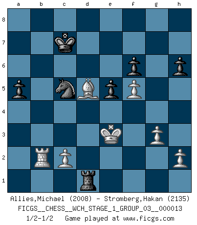 Last move : 1/2-1/2 2014 June 17 4:54:38 [Event "FICGS__CHESS__WCH_STAGE_1_GROUP_03__000013"] [Site "FICGS"] [Date "2014.03.03"] [Round "1"] [White "Allies,Michael"] [Black "Stromberg,Hakan"] [Result "1/2-1/2"] [WhiteElo "2008"] [BlackElo "2135"] 1.e4 c5 2.Nf3 d6 3.d4 cxd4 4.Nxd4 Nf6 5.Nc3 a6 6.Bc4 e6 7.Bb3 Nbd7 8.Bg5 Nc5 9.O-O Be7 10.Re1 O-O 11.f4 Re8 12.Bh4 e5 13.fxe5 dxe5 14.Nf3 b5 15.Qxd8 Bxd8 16.Rad1 Ba5 17.Bxf6 Bxc3 18.bxc3 gxf6 19.Bd5 Ra7 20.c4 Be6 21.Nd2 Rc8 22.Nf1 bxc4 23.Ng3 Kf8 24.Rf1 Nd7 25.Nf5 Rc5 26.Ne3 Rac7 27.a4 Kg7 28.Rb1 Ra5 29.Rb4 Nc5 30.Ra1 Bd7 31.Rxc4 Rxa4 32.Nf5+ Kf8 33.Rcxa4 Bxa4 34.Ra2 Bd7 35.Ra5 Bxf5 36.exf5 Ke7 37.Kf2 Kd6 38.Bf3 Rc8 39.g3 Rb8 40.Ra2 Kc7 41.Ke3 Rb1 42.Bh5 Kb6 43.Bxf7 a5 44.Bg8 h6 45.Bd5 Rd1 46.Rb2+ Kc7 1/2-1/2 Sicilian : Najdorf, Lipnitzky attack Kingside Castling by player White (move 9) Kingside Castling by player Black (move 10) This chess game ended in a draw. Follow this game move after move (download)The only thing Chess players have in common is Chess. (Lodewijk Prins) Früher wurde jeder komplizierte Zug, jedes interessante Opfer mit großem Beifall und Enthusiasmus aufgenommen. Heute schaltet man einfach seinen Fritz an, und man kann sehen, was los ist, ob der Zug geht oder nicht. (Vladimir Kramnik) Las leyes del Ajedrez no permiten una libre elección: tienes que mover quieras o no. (Emanuel Lasker) Plusieurs personnes se sont demandées comment Tal faisait pour gagner... En fait, c'est très simple ! Il met ses pièces au centre de l'échiquier et les sacrifie quelque part ! (David Bronstein) If we knew what we were doing, we would not call it research. (Albert Einstein)