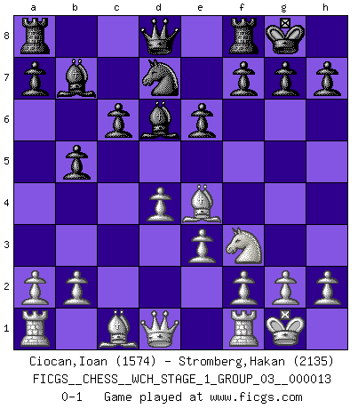 Last move : 0-1 2014 April 17 19:53:21 [Event "FICGS__CHESS__WCH_STAGE_1_GROUP_03__000013"] [Site "FICGS"] [Date "2014.03.03"] [Round "1"] [White "Ciocan,Ioan"] [Black "Stromberg,Hakan"] [Result "0-1"] [WhiteElo "1574"] [BlackElo "2135"] 1.d4 d5 2.c4 c6 3.Nf3 Nf6 4.e3 e6 5.Nc3 Nbd7 6.Bd3 dxc4 7.Bxc4 b5 8.Bd3 Bd6 9.O-O O-O 10.Ne4 Nxe4 11.Bxe4 Bb7 0-1 This chess game has been lost on time (started : 2014.03.03 0:7:34) QGD Slav : 4.e3 Kingside Castling by player White (move 9) Kingside Castling by player Black (move 9) Player Black won this chess game. Follow this game move after move (download)Chess is a part of culture and if a culture is declining then Chess too will decline. (Mikhail Botvinnik) Jeder Fehler erscheint unglaublich dumm, wenn andre ihn begehen. (Georg Christoph Lichtenberg) El Ajedrez es tan inspirador que yo no creo que un buen jugador sea capaz de tener un pensamiento malo durante una partida. (Wilhelm Steinitz) L'attaque fait le spectacle, la défense gagne les matchs. (Dicton footballistique) Gambling is the son of avarice and the father of despair. (French proverb)