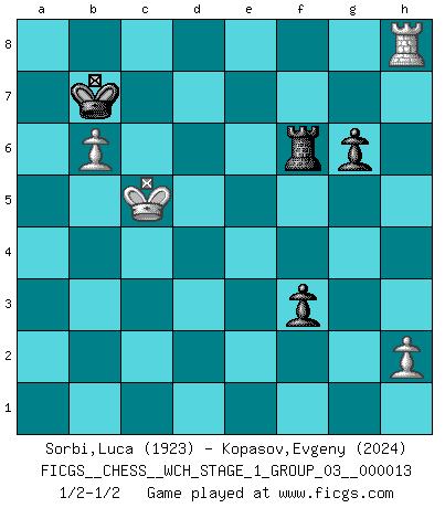 Last move : 1/2-1/2 2014 April 21 14:16:32 [Event "FICGS__CHESS__WCH_STAGE_1_GROUP_03__000013"] [Site "FICGS"] [Date "2014.03.03"] [Round "1"] [White "Sorbi,Luca"] [Black "Kopasov,Evgeny"] [Result "1/2-1/2"] [WhiteElo "1923"] [BlackElo "2024"] 1.e4 c5 2.Nf3 d6 3.d4 cxd4 4.Nxd4 Nf6 5.Nc3 a6 6.Bg5 e6 7.f4 Be7 8.Qf3 Qc7 9.O-O-O Nbd7 10.g4 b5 11.Bxf6 Nxf6 12.g5 Nd7 13.f5 O-O 14.Rg1 b4 15.Nce2 e5 16.f6 exd4 17.fxe7 Re8 18.Nxd4 Ne5 19.Qf4 Be6 20.Nf5 d5 21.Kb1 dxe4 22.Qxe4 Bxf5 23.Qxf5 Rxe7 24.Qe4 R7e8 25.Qxb4 Nf3 26.Rg2 Rad8 27.Bd3 g6 28.Qg4 Ne1 29.Rf2 Nxd3 30.cxd3 Re3 31.Rc2 Qb7 32.d4 Re4 33.Qf3 Qe7 34.Qf6 Qxf6 35.gxf6 Re6 36.Rf2 Kf8 37.d5 Red6 38.b4 Rxd5 39.Rxd5 Rxd5 40.Kb2 Ke8 41.Kc3 Re5 42.Rd2 Re6 43.a4 Rxf6 44.b5 axb5 45.axb5 Ke7 46.Kb4 Rd6 47.Rc2 f5 48.Kc5 Kd7 49.Ra2 Rf6 50.Ra7+ Kc8 51.Rxh7 f4 52.b6 f3 53.Rh8+ Kb7 1/2-1/2 Sicilian : Najdorf, 7...Be7 Queenside Castling by player White (move 9) Kingside Castling by player Black (move 13) 10 pieces endgame at move 44 : White KRPP , Black KRPPPP WHITE : King + 1 Rook 2 Pawns BLACK : King + 1 Rook 4 Pawns 9 pieces endgame at move 45 : White KRPP , Black KRPPP WHITE : King + 1 Rook 2 Pawns BLACK : King + 1 Rook 3 Pawns 8 pieces endgame at move 51 : White KRPP , Black KRPP WHITE : King + 1 Rook 2 Pawns BLACK : King + 1 Rook 2 Pawns This chess game ended in a draw. Follow this game move after move (download)It's just you and your opponent at the board and you're trying to prove something. (Bobby Fischer) Alles was ich jemals tun will ist Schach spielen. (Robert James Fischer) Los tropiezos estan todos ahí en el tablero, esperando que se cometan. (Savielly Tartakover) Des idées, des idées, j'en ai cent, j'en ai mille. Des bonnes, des mauvaises, applicables, irréalisables... Il suffit de faire le tri ! (Roos) Now the reason the enlightened prince and the wise general conquer the enemy whenever they move and their achievements surpass those of ordinary men is foreknowledge. (Sun Tzu)