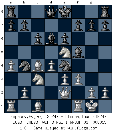 Last move : 1-0 2014 April 24 8:19:56 [Event "FICGS__CHESS__WCH_STAGE_1_GROUP_03__000013"] [Site "FICGS"] [Date "2014.03.03"] [Round "1"] [White "Kopasov,Evgeny"] [Black "Ciocan,Ioan"] [Result "1-0"] [WhiteElo "2024"] [BlackElo "1574"] 1.d4 d5 2.c4 c6 3.Nf3 Nf6 4.Nc3 dxc4 5.a4 Bf5 6.Ne5 Na6 7.e3 Nb4 8.Bxc4 e6 9.O-O Bd6 10.Qe2 Ne4 11.f3 1-0 This chess game has been lost on time (started : 2014.03.03 0:7:34) QGD Slav : Krause attack Kingside Castling by player White (move 9) Player White won this chess game. Follow this game move after move (download)There are tough players and nice guys, and I'm a tough player. (Bobby Fischer) Spiel ein langweiliges Spiel zu Ende und lustige Dinge können passieren. (Hans Ree) Un buen sacrificio es aquel que aunque no sea necesariamente sólido, deja a tu oponente aturdido y confuso. (Rudolph Spielmann) J'ai toujours senti une vague pitié pour l'homme qui ne connaît rien aux échecs, tout comme j'en aurais pour un homme ignorant de l'amour. Les Echecs, comme la musique ou comme l'amour, ont le pouvoir de rendre heureux. (Siegbert Tarrasch) Life is like a ten-speed bicycle: most of us have gears we never use. (Charles M. Schulz)