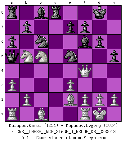 Last move : 0-1 2014 June 16 11:16:11 [Event "FICGS__CHESS__WCH_STAGE_1_GROUP_03__000013"] [Site "FICGS"] [Date "2014.03.03"] [Round "1"] [White "Kalapos,Karol"] [Black "Kopasov,Evgeny"] [Result "0-1"] [WhiteElo "1231"] [BlackElo "2024"] 1.c4 Nf6 2.d4 g6 3.e3 Bg7 4.Nf3 O-O 5.Be2 d5 6.Nc3 c5 7.dxc5 dxc4 8.O-O Qa5 9.Qd4 Nfd7 10.Qh4 Nc6 11.Bxc4 Qxc5 12.Ng5 h6 13.Nge4 Qa5 14.Nb5 Nde5 15.Be2 Rd8 16.Nc5 h5 17.a3 Bf6 18.Qf4 a6 0-1 This chess game has been lost on time (started : 2014.03.03 0:7:34) English, 1...Nf6 (Anglo-Indian defense) Kingside Castling by player Black (move 4) Kingside Castling by player White (move 8) Player Black won this chess game. Follow this game move after move (download)We cannot resist the fascination of sacrifice, since a passion for sacrifices is part of a Chessplayer's nature. (Rudolf Spielman) Wer nie einen Fehler gemacht hat, hat nie etwas Neues ausprobiert. (Albert Einstein) El Ajedrez es un mar en el cual un mosquito puede beber y un elefante puede bañarse. (Refrán Hindú) Pour moi, les échecs ne sont pas un jeu mais un art. (Alexandre Alekhine) There is far too much law for those who can afford it and far too little for those who cannot. (Derek Bok)