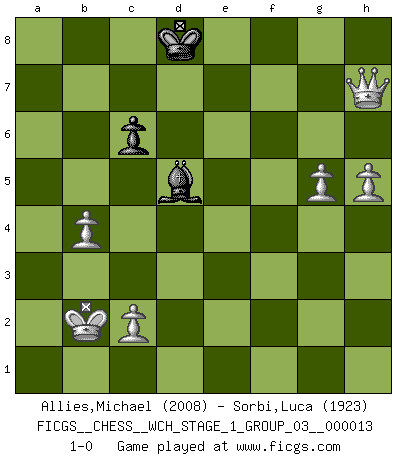 Last move : 1-0 2014 May 10 14:27:10 [Event "FICGS__CHESS__WCH_STAGE_1_GROUP_03__000013"] [Site "FICGS"] [Date "2014.03.03"] [Round "1"] [White "Allies,Michael"] [Black "Sorbi,Luca"] [Result "1-0"] [WhiteElo "2008"] [BlackElo "1923"] 1.e4 c5 2.Nf3 d6 3.d4 cxd4 4.Nxd4 Nf6 5.Nc3 a6 6.Be3 Nc6 7.Be2 e6 8.f4 Be7 9.Qd2 Bd7 10.g4 d5 11.e5 Ne4 12.Nxe4 dxe4 13.O-O-O Rc8 14.Kb1 Qc7 15.Nb5 axb5 16.Bb6 e3 17.Qxe3 Qb8 18.Bxb5 Bd8 19.Bc5 Qc7 20.f5 Be7 21.Bb6 Bg5 22.Qxg5 Qxb6 23.Qxg7 Rf8 24.a4 Qc5 25.Rd3 Qxe5 26.Qg5 Rc7 27.Rhd1 Qc5 28.Qd2 Qe7 29.Bxc6 bxc6 30.Qa5 Qd8 31.fxe6 fxe6 32.Qh5+ Rf7 33.Rf1 Qe7 34.Rdf3 Bc8 35.Rxf7 Qxf7 36.Rxf7 Rxf7 37.a5 Ke7 38.b4 Kf6 39.h4 Ke7 40.Qc5+ Kd7 41.Qa7+ Ke8 42.Qb6 e5 43.a6 Rf1+ 44.Kb2 Rf7 45.a7 Rxa7 46.Qxa7 Bd7 47.Qb8+ Ke7 48.Qxe5+ Be6 49.g5 Kd7 50.h5 Bd5 51.Qg7+ Kd8 52.Qxh7 1-0 Sicilian : Najdorf, Byrne (English) attack Queenside Castling by player White (move 13) 10 pieces endgame at move 48 : White KQPPPP , Black KBPP WHITE : King + 1 Queen 4 Pawns BLACK : King + 1 Bishop 2 Pawns 9 pieces endgame at move 52 : White KQPPPP , Black KBP WHITE : King + 1 Queen 4 Pawns BLACK : King + 1 Bishop 1 Pawn Player White won this chess game. Follow this game move after move (download)Do you realize Fischer almost never has any bad pieces? He exchanges them, and the bad pieces remain with his opponents. (Yuri Balashov) Ich habe die besten Aussichten, den ersten Preis zu gewinnen - denn jeder muss gegen Steinitz spielen, nur ich nicht! (Wilhelm Steinitz) El estómago es una parte esencial del maestro de Ajedrez. (Bent Larsen) Votre prénom est 'Tactique', votre deuxième prénom est 'Tactique' et votre nom est 'Tactique'. (Ken Smith) Information on the Internet is subject to the same rules and regulations as conversation at a bar. (George Lundberg)