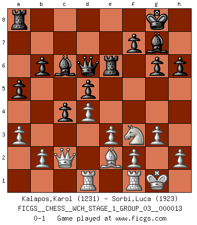 Last move : 0-1 2014 June 16 11:16:11 [Event "FICGS__CHESS__WCH_STAGE_1_GROUP_03__000013"] [Site "FICGS"] [Date "2014.03.03"] [Round "1"] [White "Kalapos,Karol"] [Black "Sorbi,Luca"] [Result "0-1"] [WhiteElo "1231"] [BlackElo "1923"] 1.d4 d5 2.c4 e6 3.Nc3 Nf6 4.Bg5 Be7 5.Nf3 O-O 6.e3 h6 7.Bxf6 Bxf6 8.Be2 b6 9.cxd5 exd5 10.O-O Bb7 11.Qc2 Re8 12.a3 c6 13.Rac1 Nd7 14.Bd3 Nf8 15.Ne2 g6 16.Nf4 Qd6 17.Be2 Bg7 18.Rcd1 Ne6 19.g3 c5 20.Nxe6 Rxe6 21.Qd2 c4 22.Qc3 Bc6 23.Qc2 a5 0-1 This chess game has been lost on time (started : 2014.03.03 0:7:34) QGD : 4.Bg5 Be7 Kingside Castling by player Black (move 5) Kingside Castling by player White (move 10) Player Black won this chess game. Follow this game move after move (download)I am still a victim of Chess. It has all the beauty of art and much more. It cannot be commercialized. Chess is much purer than art in its social position. (Marcel Duchamp) Wenn man heute mit 14 Jahren noch kein GM ist, kann man es vergessen. (Viswanathan Anand) Los tropiezos estan todos ahí en el tablero, esperando que se cometan. (Savielly Tartakover) Les ravages du H expliquent la différence de niveau entre Tal et Thal [Abergel]. You know what they say : You lie down with the Devil, you wake up in Hell. (Horatio Caine, C.S.I. Miami)