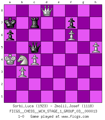 Last move : 1-0 2014 June 30 12:9:22 [Event "FICGS__CHESS__WCH_STAGE_1_GROUP_03__000013"] [Site "FICGS"] [Date "2014.03.03"] [Round "1"] [White "Sorbi,Luca"] [Black "Zmolil,Josef"] [Result "1-0"] [WhiteElo "1923"] [BlackElo "1118"] 1.e4 c5 2.Nf3 d6 3.d4 cxd4 4.Nxd4 Nf6 5.Nc3 a6 6.Bg5 e6 7.f4 Be7 8.Qf3 Qc7 9.O-O-O Nbd7 10.g4 b5 11.Bxf6 Nxf6 12.g5 Nd7 13.f5 Nc5 14.f6 gxf6 15.gxf6 Bf8 16.Rg1 h5 17.a3 Qb6 18.Kb1 Bb7 19.Bh3 b4 20.axb4 Qxb4 21.Rg5 Bc8 22.b3 Qb6 23.Rdg1 Bd7 24.e5 O-O-O 25.exd6 Bxd6 26.Bg2 Kb8 27.Rd1 Ka7 28.h4 Rc8 29.Nxe6 Bxe6 30.Rxd6 Qxd6 31.Rxc5 Qb6 32.Na4 Qb4 33.Ra5 Rhd8 34.Nc5 Rc6 35.Qxc6 Rd1+ 36.Ka2 Qxa5+ 37.Na4 Bd5 38.Qd7+ Kb8 39.Kb2 Rd2 40.Qd6+ Ka7 41.Nc3 Rxg2 42.Nxd5 Qb5 43.Nc3 Qb7 44.Qc5+ Kb8 45.Qxh5 Qc7 46.Qf5 Qd6 47.Qe4 Rg8 48.Nd5 Rd8 49.c4 Qh2+ 50.Kc3 Qg3+ 51.Kb4 Qf2 52.Qe7 Rc8 53.Ka3 Qc5+ 54.Nb4 Ka8 55.Ka4 Rc7 56.Qd8+ Ka7 57.h5 1-0 This chess game has been lost on time (started : 2014.03.03 0:7:34) Sicilian : Najdorf, 7...Be7 Queenside Castling by player White (move 9) Queenside Castling by player Black (move 24) Player White won this chess game. Follow this game move after move (download)The combination player thinks forward; he starts from the given position, and tries the forceful moves in his mind. (Emanuel Lasker) Mit Schach schule ich mein Gefühl für Geometrie, was für Tennis und Schach gleichermaßen wichtig ist. (Boris Becker) Los libros de Ajedrez deben de usarse igual como usamos los anteojos: para mejorar la vista, aunque algunos jugadores los quieren usar como si ellos les otorgaran la vision. (José Raúl Capablanca) Pour se monter efficace, un Cavalier a besoin d'avant-postes ! Les Cavaliers font les meilleurs bloqueurs de pions passés. It's not enough to succeed. Others must fail. (Gore Vidal)