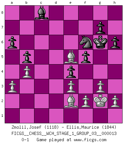 Last move : 0-1 2014 June 30 12:9:22 [Event "FICGS__CHESS__WCH_STAGE_1_GROUP_03__000013"] [Site "FICGS"] [Date "2014.03.03"] [Round "1"] [White "Zmolil,Josef"] [Black "Ellis,Maurice"] [Result "0-1"] [WhiteElo "1118"] [BlackElo "1844"] 1.c4 e5 2.Nc3 Nf6 3.Nf3 Nc6 4.g3 d5 5.cxd5 Nxd5 6.Bg2 Nb6 7.O-O Be7 8.d3 O-O 9.Be3 Be6 10.Qc1 f6 11.Ne4 Qd7 12.Rd1 Rad8 13.d4 f5 14.Nc5 Bxc5 15.dxc5 Nd5 16.Bg5 e4 17.Nd4 Nf6 18.Nxc6 Qxc6 19.Qc2 b6 20.Rxd8 Rxd8 21.Rc1 Rd5 22.b4 Qd7 23.cxb6 cxb6 24.a3 h6 25.Bf4 Rd4 26.Bf1 Rc4 27.Qb2 Kf7 28.e3 Rxc1 29.Qxc1 b5 30.Be5 a6 31.Be2 Kg6 32.Kg2 Qc8 33.Qxc8 Bxc8 0-1 This chess game has been lost on time (started : 2014.03.03 0:7:34) English Opening Kingside Castling by player White (move 7) Kingside Castling by player Black (move 8) Player Black won this chess game. Follow this game move after move (download)Checkers is for tramps. (Paul Morphy) Ohne ihre Erfolge schmälern zu wollen würde ich sagen Petrosian, Spassky und Karpov verdanken ihre Siege ihren Trainern - Boleslavsky, Bondarevsky und Furman. (Mikhail Moiseyevich Botvinik) Tu cuerpo tiene que estar en óptima condición. Tu Ajedrez se deteriora como lo hace tu cuerpo. No puedes separar la mente y el cuerpo. (Bobby Fischer) Des idées, des idées, j'en ai cent, j'en ai mille. Des bonnes, des mauvaises, applicables, irréalisables... Il suffit de faire le tri ! (Roos) Opportunities multiply as they are seized. (Sun Tzu)