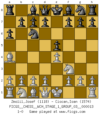 Last move : 1-0 2014 May 2 20:53:36 [Event "FICGS__CHESS__WCH_STAGE_1_GROUP_03__000013"] [Site "FICGS"] [Date "2014.03.03"] [Round "1"] [White "Zmolil,Josef"] [Black "Ciocan,Ioan"] [Result "1-0"] [WhiteElo "1118"] [BlackElo "1574"] 1.e4 e5 2.Nf3 Nc6 3.Bb5 a6 4.Ba4 1-0 This chess game has been lost on time (started : 2014.03.03 0:7:34) Ruy Lopez Player White won this chess game. Follow this game move after move (download)In Chess, at least, the brave inherit the earth. (Edmar Mednis) Ein unbeabsichtigtes Patt ist der Gipfel der Dummheit. (Anonymous) Una de estas pequeñas movidas modestas pudieran ser mas molestas a tu oponente que la amenaza mas grande. (Siegbert Tarrasch) Les Echecs, c'est l'art de la guerre sans les charniers, c'est la résurrection des morts tombés au champ d'honneur, l'espoir perpétuel, la suprématie de l'intelligence sur la force, la culture de l'esprit. (F. Szpiner) How many people work in NATO Headquarters ? - About half of them. (Dirk Stikker, NATO general secretary)
