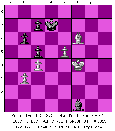 Last move : 1/2-1/2 2014 April 15 10:13:18 [Event "FICGS__CHESS__WCH_STAGE_1_GROUP_04__000013"] [Site "FICGS"] [Date "2014.03.03"] [Round "1"] [White "Ponce,Trond"] [Black "Hardfeldt,Pan"] [Result "1/2-1/2"] [WhiteElo "2127"] [BlackElo "2032"] 1.e4 e5 2.Nf3 Nc6 3.Bb5 Nf6 4.O-O Nxe4 5.d4 Nd6 6.Bxc6 dxc6 7.dxe5 Nf5 8.Qxd8+ Kxd8 9.Nc3 Ke8 10.Ne4 Be6 11.b3 Rd8 12.Bb2 Be7 13.Rad1 b6 14.c4 c5 15.Rfe1 Rd7 16.Kf1 h6 17.h3 Kd8 18.Ke2 Re8 19.Rg1 Kc8 20.g4 Nh4 21.Nxh4 Bxh4 22.f4 f5 23.Rxd7 Bxd7 24.Nd2 g6 25.Nf3 Bd8 26.Bc3 g5 27.gxf5 Bxf5 28.fxg5 Bxg5 29.Nxg5 hxg5 30.Rxg5 Bxh3 31.Ke3 Be6 32.Be1 Kd7 33.Bh4 Rg8 34.Rh5 a5 35.Bf6 Rg3+ 36.Kf2 Rh3 37.Rxh3 Bxh3 38.Ke3 a4 39.Kf4 axb3 40.axb3 Bf1 1/2-1/2 Ruy Lopez : Berlin defense, Open variation Kingside Castling by player White (move 4) 10 pieces endgame at move 40 : White KBPPP , Black KBPPP WHITE : King + 1 Bishop 3 Pawns BLACK : King + 1 Bishop 3 Pawns This chess game ended in a draw. Follow this game move after move (download)To avoid losing a piece, many a person has lost the game. (Savielly Tartakover) Du musst Deinen Gegner in einen tiefen dunklen Wald führen wo 2+2=5 ist und wo der Weg, der wieder hinausführt, nur breit genug für einen ist. (Mikhail Nekhemyevich Tal) En el Ajedrez, tal como en la vida, las bendiciones de hoy pueden ser el veneno del mañana. (Assaic) Mais l'homme est une créature légère et illogique : semblable au joueur d'échecs, il n'aime que le processus du but à atteindre, non le but lui-même. (Dostoïevsky) It is not true that people stop pursuing dreams because they grow old, they grow old because they stop pursuing dreams. (Gabriel Garcia Marquez)