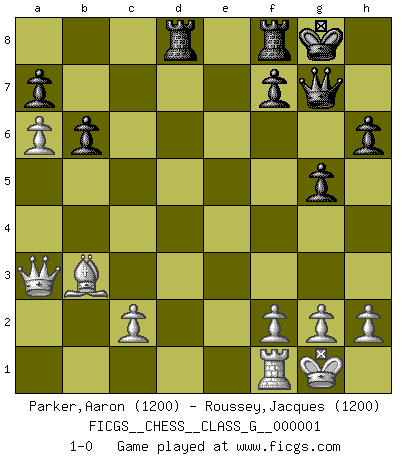 Last move : 1-0 2006 July 2 12:4:37 [Event "FICGS__CHESS__CLASS_G__000001"] [Site "FICGS"] [Date "2006.05.25"] [Round "1"] [White "Parker,Aaron"] [Black "Roussey,Jacques"] [Result "1-0"] [WhiteElo "1200"] [BlackElo "1200"] 1.e4 e6 2.d4 d5 3.Bd3 c5 4.Nf3 c4 5.Be2 Be7 6.exd5 exd5 7.O-O Nf6 8.Nc3 O-O 9.Ne5 Bd6 10.Bg5 Nbd7 11.Nxd5 h6 12.Bh4 g5 13.Bg3 Nxd5 14.Bxc4 N5b6 15.Bb3 Qc7 16.Qd3 Bxe5 17.Bxe5 Nxe5 18.dxe5 Qxe5 19.Qg6+ Qg7 20.Qd3 Bd7 21.a4 Rad8 22.Qe2 Qxb2 23.a5 Nc8 24.a6 b6 25.Qe4 Nd6 26.Qg6+ Qg7 27.Qxd6 Bb5 28.Qa3 Bxf1 29.Rxf1 1-0 French : Schlechter variation Kingside Castling by player White (move 7) Kingside Castling by player Black (move 8) Player White won this chess game. Follow this game move after move (download)Chess is like war on a board. (Bobby Fischer) Der Verteidiger gebe der Gewalt nach, aber nur der Gewalt. Er schaffe sich nicht freiwillig, etwa aus Blindheit oder aus Schrecken, irgendwelche Schwächen. Er lasse sich nicht bluffen. (Emanuel Lasker) No hay otro maestro que tenga una voluntad terrífica de ganar. Al tablero, el irradía peligro y aún los oponentes mas fuertes tienden a congelarse como liebres cuando olfatean a una pantera. Aún sus debilidades son peligrosas. Con las blancas, su juego de apertura es predecible - te es posible hacer planes en su contra - pero es tan fuerte que tus planes casi nunca funcionan. En el juego medio, su precisión e invención son fabulosas y en finales, tú simplemente no le puedes vencer. (Experto Alemán anónimo) Il n'y a pas eu de défaite parce que je ne crois pas que cet ordinateur ait jamais existé. IBM a triché en refusant d'imprimer les modes de recherche de la machine. C'est évident, pendant le match, des coups décisifs ont été joués par des êtres humains. Aujourd'hui, les meilleurs spécialistes en informatique ne peuvent toujours pas expliquer comment Deep-Blue a pu jouer contre la logique des ordinateurs. IBM a gagné une guerre de communication, mais ils sont incapables de prouver que l'ordinateur a gagné tout seul. (Garry Kasparov) If you ain't just a little scared when you enter a casino, you are either very rich or you haven't studied the games enough. (Pappy)