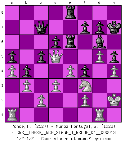 Last move : 1/2-1/2 2014 May 15 3:52:28 [Event "FICGS__CHESS__WCH_STAGE_1_GROUP_04__000013"] [Site "FICGS"] [Date "2014.03.03"] [Round "1"] [White "Ponce,Trond"] [Black "Munoz Portugal,Guillermo"] [Result "1/2-1/2"] [WhiteElo "2127"] [BlackElo "1928"] 1.e4 e5 2.Nf3 Nc6 3.Bb5 a6 4.Ba4 Nf6 5.O-O Be7 6.Bxc6 dxc6 7.Re1 Qd6 8.d3 O-O 9.Bg5 h6 10.Bd2 Bg4 11.h3 Bh5 12.Bc3 Nd7 13.Nbd2 b5 14.Nf1 Qf6 15.g4 Bg6 16.a4 Bd6 17.Ng3 Rfe8 18.Kg2 Bh7 19.Bd2 Nf8 20.Nf5 c5 21.Qb1 b4 22.Qa2 Ne6 23.Qd5 a5 24.Be3 Rad8 25.Rad1 Rc8 26.Rh1 Nf4 27.Bxf4 exf4 28.Nxd6 cxd6 29.b3 Re6 30.Qb7 Qd8 31.Rhe1 Rc7 32.Qd5 Rd7 33.Rg1 Rde7 34.Rde1 Qc7 35.h4 Kh8 36.g5 h5 37.Kh1 Re8 38.Kh2 Bg6 39.Rd1 Kg8 40.Rdf1 Rd8 41.Ra1 Re7 42.Rac1 Qd7 43.Rg2 Qc7 44.Rd1 Kh8 45.Rdg1 Re7e8 46.Rc1 Re7 47.R2g1 Kh7 48.Rcf1 Qc8 49.Rg2 Qc7 50.Ra1 Kg8 51.Rag1 Kh8 52.Rb1 Re6 53.R2g1 Kh7 54.Rbd1 Re6e8 55.Rde1 Rd7 56.Rc1 Kg8 57.Rcd1 Rd7d8 58.Rde1 Re6 59.Rg2 Rc8 60.Rd1 Rce8 61.R2g1 Rb8 62.Rc1 Rc8 63.Rcd1 Kh7 64.Rde1 Rce8 65.Rc1 R6e7 66.Ra1 Re6 67.Rae1 R6e7 68.Ra1 Re7e6 69.Rae1 Re6e7 70.Ra1 Re7e6 1/2-1/2 Ruy Lopez : Exchange variation doubly deferred (DERLD) Kingside Castling by player White (move 5) Kingside Castling by player Black (move 8) This chess game ended in a draw. Follow this game move after move (download)Chess is a matter of delicate judgment, knowing when to punch and how to duck. (Bobby Fischer) Nie in meinem Leben habe ich die französische Verteidigung gespielt, welche die Stumpfsinnigste von allen ist. (Wilhelm Steinitz) El Ajedrez es un juego terrible. Si no dominas el centro, tu oponente tiene una posición mas libre. Si tu tienes el centro, entonces realmente tienes algo de que preocuparte. (Siegbert Tarrasch) Le jeu d'échecs fait naître et fortifie en nous plusieurs qualités précieuses dans le cours de l'existence, telles que la prévoyance, la circonspection, la prudence, et la persévérance. (Benjamin Franklin - 1783, la morale des échecs) Only sick music makes money today. (Friedrich Nietzsche)