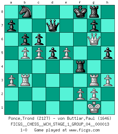 Last move : 1-0 2014 April 4 17:9:45 [Event "FICGS__CHESS__WCH_STAGE_1_GROUP_04__000013"] [Site "FICGS"] [Date "2014.03.03"] [Round "1"] [White "Ponce,Trond"] [Black "von Buttlar,Paul"] [Result "1-0"] [WhiteElo "2127"] [BlackElo "1646"] 1.e4 e6 2.d4 d5 3.exd5 exd5 4.Nf3 Bd6 5.Bd3 Ne7 6.O-O Bf5 7.Bxf5 Nxf5 8.Qd3 Qd7 9.c4 c6 10.Re1+ Ne7 11.c5 Bc7 12.Qe2 Kf8 13.Nc3 f6 14.Qd3 Na6 15.Rb1 Nb4 16.Qd1 Re8 17.a3 Na6 18.b4 Kf7 19.b5 Nb8 20.Qd3 Ba5 21.Bd2 Nf5 22.Rec1 h5 23.h3 Rc8 24.Rc2 Bxc3 25.Rxc3 b6 26.Bf4 Ne7 27.Bd6 Rhe8 28.Bxe7 Rxe7 29.Qh7 Re4 30.Ne5+ fxe5 31.dxe5 Rf4 32.Rg3 Rg8 33.Qg6+ Kf8 34.R1b3 1-0 French : Exchange variation Kingside Castling by player White (move 6) Player White won this chess game. Follow this game move after move (download)If I win a tournament, I win it by myself. I do the playing. Nobody helps me. (Bobby Fischer) Es hat in meinem Leben Zeiten gegeben, da ich sehr nahe daran war zu glauben, daß ich auch nicht eine einzige Schachpartie verlieren könnte. (José Raúl Capablanca) Existen dos clases de sacrificios: los correctos y los míos. (Mikhail Tal) Le joueur d'Echecs qui veut atteindre le top est obligé de développer son propre credo créatif. Alexeï Stepanovicth Souétine. Il est facile d'écrire des livres ! Ce qui est difficile, c'est de jouer ! (Alexeï Stepanovicth Souétine) A mistake is only a mistake if you let it happen twice. Otherwise it is a learning experience. (Daniel Parmet)