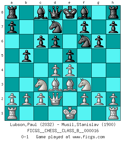 Last move : 0-1 2007 March 26 20:55:25 [Event "FICGS__CHESS__CLASS_B__000016"] [Site "FICGS"] [Date "2007.02.13"] [Round "1"] [White "Lubson,Paul"] [Black "Musil,Stanislav"] [Result "0-1"] [WhiteElo "2032"] [BlackElo "1900"] 1.e4 d6 2.d4 Nf6 3.Nc3 g6 4.Be3 c6 5.Qd2 b5 6.Bd3 Nbd7 7.Nf3 e5 0-1 This chess game has been lost on time (started : 2007.02.13 12:59:1) Pirc : 150 attack Player Black won this chess game. Follow this game move after move (download)Bobby Fischer is the greatest Chess player who has ever lived. (Ken Smith) Ich habe Putins Aufstieg an die Macht beobachtet und seine Politik, die demokratischen Institutionen meines Landes zu zerstören. (Garry Kasparov) El pensamiento metódico es mas útil en el Ajedrez que la inspiración. (C. J. S. Purdy) Même un GMI sait rarement calculer sur plus de cinq coups une attaque à sacrifices. (Rudolf Spielmann) Luck never made a man wise. (Seneca, Letters to Lucilius)