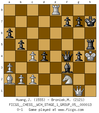 Last move : 0-1 2014 June 25 23:19:9 [Event "FICGS__CHESS__WCH_STAGE_1_GROUP_05__000013"] [Site "FICGS"] [Date "2014.03.03"] [Round "1"] [White "Huang,Jing"] [Black "Broniek,Mariusz Maciej"] [Result "0-1"] [WhiteElo "1555"] [BlackElo "2121"] 1.e4 c5 2.Nf3 d6 3.Nc3 Nf6 4.Bc4 e6 5.O-O a6 6.d3 Nc6 7.h3 b5 8.Bb3 Be7 9.Re1 O-O 10.Bg5 h6 11.Bf4 Bb7 12.a3 Qc7 13.Be3 Rfd8 14.Qe2 d5 15.exd5 exd5 16.Bd2 c4 17.Ba2 Bd6 18.Nd1 Re8 19.Qf1 Ne5 20.Nd4 Bc5 21.Be3 Neg4 22.hxg4 Nxg4 23.g3 Nxe3 24.Rxe3 Bxd4 25.Rxe8+ Rxe8 26.Kh2 Re5 27.Kg2 Bxf2 28.Nxf2 Rg5 29.g4 d4 30.Kh3 h5 31.Re1 Bf3 32.Re8+ Kh7 33.Qg1 hxg4+ 34.Kh4 Qf4 35.dxc4 Rh5+ 0-1 Sicilian Kingside Castling by player White (move 5) Kingside Castling by player Black (move 9) Player Black won this chess game. Follow this game move after move (download)When you don't know what to do, wait for your opponent to get an idea - it's sure to be wrong. (Tarrasch) Wenn ich mich einlogge, glauben die Leute gewöhnlich nicht, dass ich es selbst bin und sie fangen an, mir dumme Fragen zu stellen. Und wenn sie es glauben, stellen sie wieder andere dumme Fragen. (Judith Polgar) Fischer sacrificó virtualmente todo lo que la mayoría de nosotros los 'debiles' (término que él usa) valoramos, respetamos y apreciamos por el amor de un astuto, a menudo hermoso tablero de juego, por el privilegio ambivalente de ser su mas grande maestro. (Paul Kollar) La victoire dans une partie d'Echecs appartient la plupart du temps à celui qui voit un peu plus loin que l'adversaire. (Lasker) This is where the fun begins. (Anakin Skywalker in Star Wars ep.3)