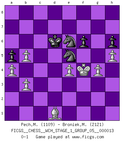 Last move : 0-1 2014 September 21 8:8:48 [Event "FICGS__CHESS__WCH_STAGE_1_GROUP_05__000013"] [Site "FICGS"] [Date "2014.03.03"] [Round "1"] [White "Pech,Matej"] [Black "Broniek,Mariusz Maciej"] [Result "0-1"] [WhiteElo "1109"] [BlackElo "2121"] 1.e4 c5 2.Nf3 d6 3.d4 cxd4 4.Nxd4 Nf6 5.Nc3 a6 6.Be3 e6 7.f3 b5 8.Qd2 Nbd7 9.g4 b4 10.Nce2 h6 11.O-O-O Qc7 12.Qxb4 d5 13.Qc3 Qxc3 14.Nxc3 e5 15.Nb3 d4 16.Nxd4 exd4 17.Bxd4 Bc5 18.h4 Bb7 19.Ne2 O-O-O 20.b3 Ne8 21.Bxc5 Nxc5 22.Rxd8+ Kxd8 23.Kd2 Kc7 24.c4 a5 25.Nc3 Bc6 26.Be2 Nf6 27.Ke3 Re8 28.Rc1 g5 29.h5 Nfd7 30.Rc2 f6 31.Nb5+ Bxb5 32.cxb5 Rh8 33.Rc1 Rd8 34.Rc4 Kd6 35.Rc1 Rc8 36.Rd1+ Ke5 37.Rd5+ Ke6 38.Rd2 Nb7 39.a4 Rc1 40.Rd1 Rxd1 41.Bxd1 Kd6 42.f4 gxf4+ 43.Kxf4 Ke6 44.Be2 Nd6 45.Bd3 Nc5 46.Bc2 Nf7 47.Bd1 Ne5 48.Bc2 Kd6 49.Bd1 Ne6+ 0-1 This chess game has been lost on time (started : 2014.03.03 0:11:7) Sicilian : Najdorf, Byrne (English) attack Queenside Castling by player White (move 11) Queenside Castling by player Black (move 19) Player Black won this chess game. Follow this game move after move (download)Those who say they understand Chess, understand nothing. (Robert Hubner) Ich bin stolz ein Bulgare zu sein. (Veselin Topalov) Entre mas años cumplo, mas valoro los Peones. (Keres) L'action d'une oeuvre littéraire se déroule sur un champ de bataille. Les masques et les types du drame moderne correspondent aux pièces du jeu d'échecs. L'intrigue correspond aux coups et aux gambits, c'est à dire aux techniques du jeu telles qu'utilisées et interprétées par les joueurs. Les tactiques et les péripéties [mouvements] correspondent aux coups exécutés par l'adversaire. (Viktor Shklovsky) However beautiful the strategy, you should occasionally look at the results. (Winston Churchill)