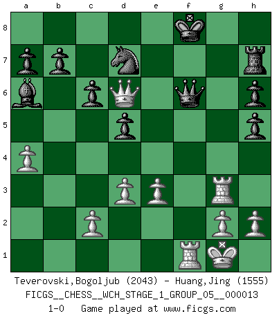 Last move : 1-0 2014 June 17 10:41:21 [Event "FICGS__CHESS__WCH_STAGE_1_GROUP_05__000013"] [Site "FICGS"] [Date "2014.03.03"] [Round "1"] [White "Teverovski,Bogoljub"] [Black "Huang,Jing"] [Result "1-0"] [WhiteElo "2043"] [BlackElo "1555"] 1.Nf3 Nf6 2.b3 e6 3.Bb2 Nc6 4.e3 d5 5.Bb5 Bd7 6.Bxc6 Bxc6 7.Ne5 Bb5 8.f4 Bb4 9.a3 Bd6 10.a4 Ba6 11.d3 O-O 12.O-O Nd7 13.Qh5 f6 14.Nf3 Qe8 15.Qg4 e5 16.Re1 Rf7 17.Nc3 c6 18.Nh4 Nb6 19.Nf5 Qd7 20.b4 Bxb4 21.fxe5 Bxc3 22.e6 h5 23.exf7+ Qxf7 24.Nh6+ Kf8 25.Qf4 gxh6 26.Bxc3 Kg7 27.Rf1 Nd7 28.Rf3 Rh8 29.Rg3+ Kf8 30.Rf1 Rh7 31.Bxf6 Qxf6 32.Qd6+ 1-0 Reti Opening Kingside Castling by player Black (move 11) Kingside Castling by player White (move 12) Player White won this chess game. Follow this game move after move (download)Blessed be the memory of him who gave the world this immortal game. (A. G. Gardiner) Frage: Wie viele Autos haben Sie schon zerstört? - Antwort: Nur zwei. (Loek van Wely) Muchos jugadores de Ajedrez se sorprendían cuando después de la partida, Fischer explicaba con calma: 'Yo ya había analizado esta posibilidad' en una posición en la cual yo creía que no era posible de prever desde la apertura. (Mikhail Tal) RxDa4 pat (...) Yoga is 99% practice and 1% knowledge. (Sri Krishna Pattabhi Jois)