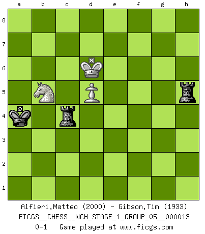 Last move : 0-1 2014 July 12 5:32:27 [Event "FICGS__CHESS__WCH_STAGE_1_GROUP_05__000013"] [Site "FICGS"] [Date "2014.03.03"] [Round "1"] [White "Alfieri,Matteo"] [Black "Gibson,Tim"] [Result "0-1"] [WhiteElo "2000"] [BlackElo "1933"] 1.e4 e5 2.Nf3 Nc6 3.d4 exd4 4.Nxd4 Bc5 5.Nb3 Bb6 6.Nc3 Nf6 7.Bg5 h6 8.Bh4 O-O 9.Qf3 g5 10.Bg3 d5 11.Nxd5 Nxd5 12.exd5 Re8+ 13.Be2 Ne5 14.Qc3 Bg4 15.O-O-O Bxe2 16.Bxe5 Bxd1 17.Rxd1 Bxf2 18.Kb1 Qe7 19.Bxc7 Qe2 20.Qf3 Bb6 21.Bxb6 Qxf3 22.gxf3 axb6 23.Nd4 Kg7 24.b3 Kf6 25.Rd3 Re1+ 26.Kb2 Ke5 27.c4 h5 28.a4 g4 29.fxg4 hxg4 30.h3 f5 31.hxg4 fxg4 32.Kc3 Rg8 33.Nc2 Re2 34.Nd4 Re4 35.Rd1 Re3+ 36.Kb4 g3 37.Nc2 Re2 38.Ne1 Kd6 39.Kb5 Rge8 40.Nf3 Rb2 41.Nd4 g2 42.Kxb6 Rh8 43.Rg1 Rh1 44.Rxg2 Rxg2 45.Kxb7 Rg4 46.Nb5+ Kc5 47.b4+ Kxb4 48.Kc6 Rxc4+ 49.Kd6 Rh6+ 50.Ke5 Rh5+ 51.Kd6 Kxa4 0-1 Scotch : Potter variation Kingside Castling by player Black (move 8) Queenside Castling by player White (move 15) 10 pieces endgame at move 44 : White KNPPPP , Black KRRP WHITE : King + 1 Knight 4 Pawns BLACK : King + 2 Rooks 1 Pawn 9 pieces endgame at move 45 : White KNPPPP , Black KRR WHITE : King + 1 Knight 4 Pawns BLACK : King + 2 Rooks 8 pieces endgame at move 47 : White KNPPP , Black KRR WHITE : King + 1 Knight 3 Pawns BLACK : King + 2 Rooks 7 pieces endgame at move 48 : White KNPP , Black KRR WHITE : King + 1 Knight 2 Pawns BLACK : King + 2 Rooks 6 pieces endgame at move 51 : White KNP , Black KRR WHITE : King + 1 Knight 1 Pawn BLACK : King + 2 Rooks Player Black won this chess game. Follow this game move after move (download)What is the object of playing a gambit opening?... To acquire a reputation of being a dashing player at the cost of losing a game. (Siegbert Tarrasch) Schachspieler können ausgezeichnet Varianten am Schachbrett berechnen, aber nicht im realen Leben. Zu stark ist der Individualismus im Schach ausgeprägt, und für viele ist ein kleiner momentaner persönlicher Vorteil wichtiger als ein weit größerer Vorteil von morgen. (Anatoly Karpov) Antes de los Finales, los dioses han colocado el Juego Medio. (Siegbert Tarrasch) Donnez-moi un Cavalier en 6e et je gagnerais toutes mes parties. (Steinitz) A generalist learns less and less about more and more until he knows nothing about everything. (Author unknown)