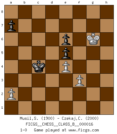 Last move : 1-0 2007 November 22 12:52:5 [Event "FICGS__CHESS__CLASS_B__000016"] [Site "FICGS"] [Date "2007.02.13"] [Round "1"] [White "Musil,Stanislav"] [Black "Czekaj,Christophe"] [Result "1-0"] [WhiteElo "1900"] [BlackElo "2000"] 1.d4 Nf6 2.Bg5 c5 3.Bxf6 exf6 4.c3 d5 5.dxc5 Bxc5 6.e3 O-O 7.Nd2 Nc6 8.Nb3 Bb6 9.Bd3 Be6 10.Nf3 Ne5 11.Nbd4 Bg4 12.Qc2 Nxd3+ 13.Qxd3 Bh5 14.O-O Re8 15.Rfd1 Bg6 16.Nf5 Qc7 17.N3h4 Bh5 18.Rd2 Re5 19.Ng3 Bg4 20.Nf3 Bxf3 21.gxf3 Rd8 22.Rad1 Qc6 23.f4 Re7 24.Qe2 Red7 25.Qg4 g6 26.f5 Bc7 27.Ne2 Re7 28.b3 Re5 29.c4 Ba5 30.Rd3 Qe8 31.Rxd5 b5 32.Nf4 R8xd5 33.Rxd5 bxc4 34.bxc4 Qb8 35.Rxe5 fxe5 36.Nd5 Qb2 37.f6 h5 38.Qd1 Kh7 39.Ne7 Qb6 40.Qf3 Qe6 41.Nd5 Bd8 42.e4 Qa6 43.Qb3 Bxf6 44.Qb5 Qe6 45.Qd7 Kg7 46.Qxe6 fxe6 47.Nxf6 Kxf6 48.Kg2 g5 49.Kg3 Ke7 50.f3 Kd6 51.h4 gxh4+ 52.Kxh4 Kc5 53.Kxh5 Kxc4 54.Kg6 1-0 Trompowsky attack (Ruth, Opovcensky Opening) Kingside Castling by player Black (move 6) Kingside Castling by player White (move 14) 10 pieces endgame at move 52 : White KPPPP , Black KPPPP WHITE : King + 4 Pawns BLACK : King + 4 Pawns 9 pieces endgame at move 53 : White KPPPP , Black KPPP WHITE : King + 4 Pawns BLACK : King + 3 Pawns 8 pieces endgame at move 53 : White KPPP , Black KPPP WHITE : King + 3 Pawns BLACK : King + 3 Pawns Player White won this chess game. Follow this game move after move (download)If one piece is badly posted, the whole game is bad. (Tarrasch) Ja, jede Frau in Holland liebt mich bestimmt, und alle Männer hassen mich. (Loek van Wely) El Ajedrez es el gimnasio de la mente. (Blaise Pascal) Je fais ceci parce que dans cinquante coups j'obtiendrai cela; je m'appelle Mikhail Moisevitch Botvinnik. (Botvinnik) Whatever you do, don't be bored. This is absolutely the most exciting time we could have possibly hoped to be alive. And things are just starting. (From movie Waking life)