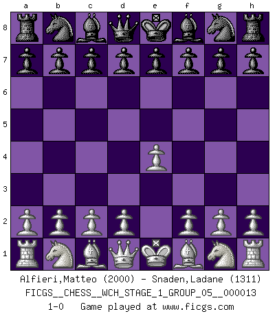 Last move : 1-0 2014 April 12 7:47:24 [Event "FICGS__CHESS__WCH_STAGE_1_GROUP_05__000013"] [Site "FICGS"] [Date "2014.03.03"] [Round "1"] [White "Alfieri,Matteo"] [Black "Snaden,Ladane"] [Result "1-0"] [WhiteElo "2000"] [BlackElo "1311"] 1.e4 1-0 This chess game has been lost on time (started : 2014.03.03 0:11:7) King's pawn Opening Player White won this chess game. Follow this game move after move (download)No Chess Grandmaster is normal; they only differ in the extent of their madness. (Viktor Korchnoi) Ja, jede Frau in Holland liebt mich bestimmt, und alle Männer hassen mich. (Loek van Wely) El Ajedrez es el gimnasio de la mente. (Blaise Pascal) Je fais ceci parce que dans cinquante coups j'obtiendrai cela; je m'appelle Mikhail Moisevitch Botvinnik. (Botvinnik) Experiences are the keys to life. (Daniel Parmet)