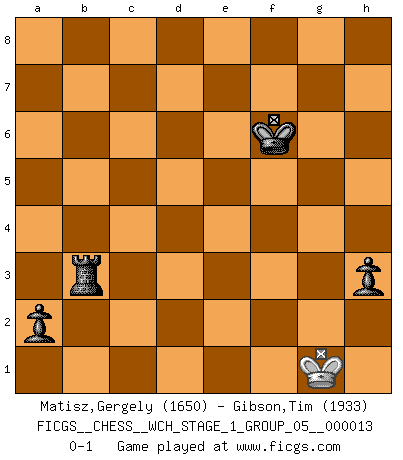 Last move : 0-1 2014 September 18 13:22:22 [Event "FICGS__CHESS__WCH_STAGE_1_GROUP_05__000013"] [Site "FICGS"] [Date "2014.03.03"] [Round "1"] [White "Matisz,Gergely"] [Black "Gibson,Tim"] [Result "0-1"] [WhiteElo "1650"] [BlackElo "1933"] 1.Nf3 d5 2.d4 Nf6 3.c4 e6 4.Nc3 Be7 5.Bf4 O-O 6.e3 Nbd7 7.Qc2 c5 8.dxc5 Nxc5 9.Be2 b6 10.O-O Bb7 11.Rfd1 Rc8 12.Nd2 Bd6 13.Bxd6 Qxd6 14.b4 Ncd7 15.Qb2 Ne5 16.cxd5 Nxd5 17.Nxd5 Bxd5 18.a4 Rfd8 19.Ba6 Rc6 20.Bb5 R6c8 21.Nf1 f5 22.f3 Rf8 23.Ng3 f4 24.Nf1 fxe3 25.Nxe3 Ng6 26.Bc4 Qf4 27.Nxd5 Qxc4 28.Rac1 Qh4 29.Qe2 Rce8 30.g3 Qh5 31.Nc7 Re7 32.Rc3 Ne5 33.Rf1 Nf7 34.Kg2 Qf5 35.Rd1 Ng5 36.Nb5 e5 37.Re3 Qh3+ 38.Kh1 Rd7 39.Nd6 Qh5 40.h4 Rfd8 41.Red3 Qg6 42.hxg5 Rxd6 43.Rxd6 Rxd6 44.Qc4+ Qe6 45.Qxe6+ Rxe6 46.Rd7 e4 47.Kg2 exf3+ 48.Kxf3 a5 49.bxa5 bxa5 50.Rd5 Ra6 51.Rf5 Ra8 52.Ke4 h6 53.gxh6 gxh6 54.Kf4 Kg7 55.Rb5 Ra6 56.g4 Rf6+ 57.Kg3 Ra6 58.Kf2 Rf6+ 59.Ke3 Re6+ 60.Kf4 Rf6+ 61.Ke5 Rg6 62.Kf5 Rg5+ 63.Ke4 Rxg4+ 64.Kf5 Rg5+ 65.Kf4 Kg6 66.Ke3 h5 67.Rb6+ Kf7 68.Kf4 Rg4+ 69.Ke3 Rxa4 70.Rb5 h4 71.Kf3 Ra3+ 72.Kg2 a4 73.Rb4 h3+ 74.Kh2 Kf6 75.Rb3 Rxb3 76.Kh1 a3 77.Kg1 a2 0-1 Reti Opening Kingside Castling by player Black (move 5) Kingside Castling by player White (move 10) 10 pieces endgame at move 49 : White KRPPP , Black KRPPP WHITE : King + 1 Rook 3 Pawns BLACK : King + 1 Rook 3 Pawns 9 pieces endgame at move 53 : White KRPPP , Black KRPP WHITE : King + 1 Rook 3 Pawns BLACK : King + 1 Rook 2 Pawns 8 pieces endgame at move 53 : White KRPP , Black KRPP WHITE : King + 1 Rook 2 Pawns BLACK : King + 1 Rook 2 Pawns 7 pieces endgame at move 63 : White KRP , Black KRPP WHITE : King + 1 Rook 1 Pawn BLACK : King + 1 Rook 2 Pawns 6 pieces endgame at move 69 : White KR , Black KRPP WHITE : King + 1 Rook BLACK : King + 1 Rook 2 Pawns 5 pieces endgame at move 75 : White K , Black KRPP WHITE : King + BLACK : King + 1 Rook 2 Pawns Player Black won this chess game. Follow this game move after move (download)Combinations have always been the most intriguing aspect of Chess. The masters look for them, the public applauds them, the critics praise them. It is because combinations are possible that Chess is more than a lifeless mathematical exercise. They are the poetry of the game; they are to Chess what melody is to music. They represent the triumph of mind over matter. (Reuben Fine) Was ist der Unterschied zwischen einem Strassenarbeiter und einem Schachspieler? --Der Schachspieler bewegt sich ab und zu. (Anonymous) Entre mas años cumplo, mas valoro los Peones. (Keres) Les Echecs ne sont pas pour les âmes timides. Ils requièrent un homme entier, qui ne s'arrête pas aveuglément à ce qui a été déjà établi, mais qui tente individuellement de sonder les profondeurs du jeu. (W. Steinitz) I don't believe in psychology. I believe in good moves. (Bobby Fischer)