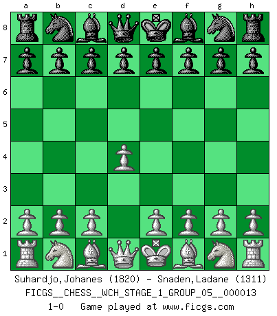 Last move : 1-0 2014 April 2 19:9:9 [Event "FICGS__CHESS__WCH_STAGE_1_GROUP_05__000013"] [Site "FICGS"] [Date "2014.03.03"] [Round "1"] [White "Suhardjo,Johanes"] [Black "Snaden,Ladane"] [Result "1-0"] [WhiteElo "1820"] [BlackElo "1311"] 1.d4 1-0 This chess game has been lost on time (started : 2014.03.03 0:11:7) Queen's pawn Player White won this chess game. Follow this game move after move (download)What would Chess be without silly mistakes ? (Kurt Richter) Bobby Fischer ist kein Vorbild für die heutige Jugend. (Viktor Kortschnoi) Una partida de Ajedrez se divide en 3 etapas: la primera cuando piensas que tienes la ventaja, la segunda cuando crees que tienes la ventaja y la tercera... ¡cuando te das cuenta que vas a perder!. (Savielly Tartakower) Tout change constamment, y compris dans le monde des Echecs. (Botvinnik) When you stop learning you start dying. (Scott Adams)