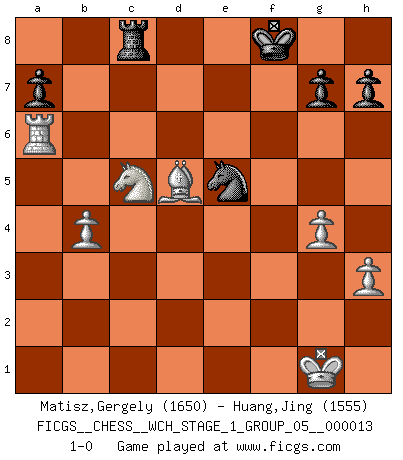 Last move : 1-0 2014 July 6 3:10:15 [Event "FICGS__CHESS__WCH_STAGE_1_GROUP_05__000013"] [Site "FICGS"] [Date "2014.03.03"] [Round "1"] [White "Matisz,Gergely"] [Black "Huang,Jing"] [Result "1-0"] [WhiteElo "1650"] [BlackElo "1555"] 1.Nf3 d5 2.d4 Nf6 3.c4 dxc4 4.Qa4+ Nc6 5.e3 Bd7 6.Bxc4 e6 7.Qc2 Bd6 8.Nbd2 O-O 9.e4 e5 10.dxe5 Bxe5 11.O-O Qe7 12.Re1 Rfd8 13.Bf1 Nd4 14.Nxd4 Bxd4 15.Nf3 Bb6 16.e5 Ng4 17.Bg5 Qc5 18.Qxc5 Bxc5 19.Bh4 Re8 20.h3 Nh6 21.Rac1 Bb6 22.g4 Kh8 23.Bg2 c6 24.Ng5 Be6 25.Ne4 Bc7 26.f4 Bxa2 27.Nd6 Reb8 28.Ra1 Bb3 29.Ra3 Be6 30.Rd3 Bd8 31.Bxd8 Rxd8 32.f5 Bc4 33.Rd4 Ba2 34.e6 fxe6 35.fxe6 Bxe6 36.Rxe6 Rd7 37.Rb4 Kg8 38.Rxb7 Rxb7 39.Nxb7 Nf7 40.Rxc6 Rb8 41.Ra6 Ne5 42.b4 Rc8 43.Bd5+ Kf8 44.Nc5 1-0 Reti Opening Kingside Castling by player Black (move 8) Kingside Castling by player White (move 11) Player White won this chess game. Follow this game move after move (download)There must have been a time when men were demigods, or they could not have invented Chess. (Gustav Schenk) Kann Schach nicht schließlich das Nationalspiel der Deutschen werden? Und welche weiteren Ausblicke bieten sich dann dar! Welche Hebung des allgemeinen Kultur-Niveaus, ja der Moral, wenn das Schachbrett den Kartentisch verdrängen würde! Wahrlich, ein Ziel, des Schweißes der Edlen wert! (Siegbert Tarrasch) Antes de los Finales, los dioses han colocado el Juego Medio. (Siegbert Tarrasch) Il s'avisa de me proposer d'apprendre les échecs qu'il jouait un peu... me voilà forcené des échecs. J'achète un échiquier, je m'enferme dans ma chambre, j'y passe des jours et des nuits à vouloir apprendre par cur toutes les parties. (Jean-Jacques Rousseau, Confessions) Now you put water in a cup, it becomes the cup; You put water into a bottle it becomes the bottle; You put it in a teapot it becomes the teapot. Water can flow or it can crash. Be water, my friend. (Bruce Lee)