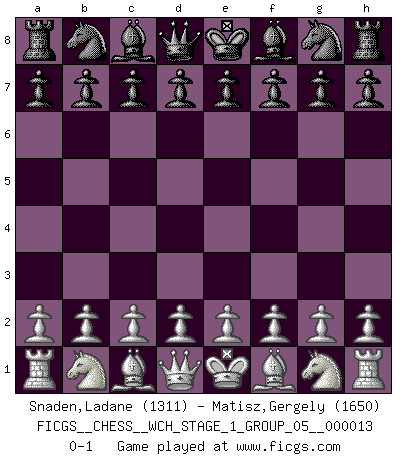 Last move : 0-1 2014 April 2 7:7:28 [Event "FICGS__CHESS__WCH_STAGE_1_GROUP_05__000013"] [Site "FICGS"] [Date "2014.03.03"] [Round "1"] [White "Snaden,Ladane"] [Black "Matisz,Gergely"] [Result "0-1"] [WhiteElo "1311"] [BlackElo "1650"] 0-1 This chess game has been lost on time (started : 2014.03.03 0:11:7) Player Black won this chess game. Follow this game move after move (download)It was clear to me that the vulnerable point of the American Grandmaster (Bobby Fischer) was in double-edged, hanging, irrational positions, where he often failed to find a win even in a won position. (Efim Geller) Ich trinke, ich rauche, ich spiele, ich liebe Frauen aber Fernschach ist ein Laster, das ich nicht habe. (Mikhail Nekhemyevich Tal) El Ajedrez es una manera fabulosa para que los niños aprendan a autovalorarse y a autoestimarse. (Saudin Robovic) Aux échecs, les retours au sommet sont rares : les dommages psychologiques consécutifs à une défaite sont trop sévères. (Daily Telegraph) The leaves of memory seemed to make a mournful rustling in the dark. (Henry Wadsworth Longfellow)