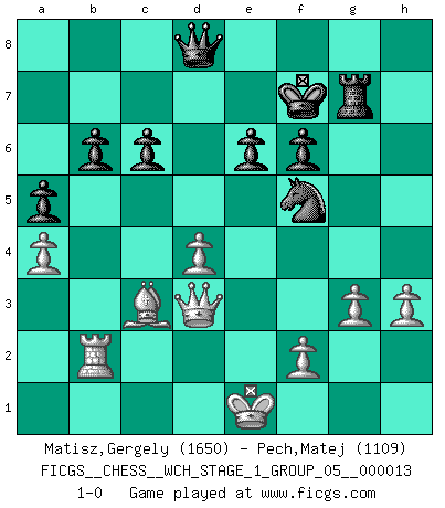 Last move : 1-0 2014 August 22 11:47:56 [Event "FICGS__CHESS__WCH_STAGE_1_GROUP_05__000013"] [Site "FICGS"] [Date "2014.03.03"] [Round "1"] [White "Matisz,Gergely"] [Black "Pech,Matej"] [Result "1-0"] [WhiteElo "1650"] [BlackElo "1109"] 1.Nf3 d5 2.d4 Nf6 3.c4 c6 4.Nc3 dxc4 5.a4 Bf5 6.e3 e6 7.Bxc4 Bb4 8.O-O O-O 9.Qe2 Nbd7 10.e4 Bg6 11.Bd3 Bh5 12.e5 Nd5 13.h3 Bxc3 14.bxc3 Nxc3 15.Bxh7+ Kxh7 16.Qc2+ Kg8 17.Qxc3 Nb6 18.Bg5 Nd5 19.Qd2 f6 20.exf6 gxf6 21.Bh6 Rf7 22.Nh4 Rh7 23.Ra3 Qd6 24.Rg3+ Kf7 25.Qb2 b6 26.Bd2 Rg8 27.Qb1 Rhg7 28.Re1 Bg6 29.Qd1 a5 30.Qe2 Bh7 31.Qh5+ Bg6 32.Nxg6 Rxg6 33.Rb1 Qd8 34.Rxg6 Rxg6 35.g3 Ne7 36.Qh7+ Rg7 37.Qd3 Nf5 38.Bc3 Rg8 39.Kf1 Rg7 40.Rb2 Rg8 41.Ke2 Rg7 42.Ke1 1-0 Reti Opening Kingside Castling by player White (move 8) Kingside Castling by player Black (move 8) Player White won this chess game. Follow this game move after move (download)When I have White, I win because I am white; When I have Black, I win because I am Bogolyubov. (Bogolyubov) Die Fehler sind da, Sie warten nur darauf gemacht zu werden. (Savielly Grigorievitsch Tartakower) Yo he agregado estos principios a la ley: pongan los Caballos en acción antes de que los dos Alfiles sean desarrollados. (Emanuel Lasker) RxDa4 pat (...) Warrior pose battles inner weakness and wins focus. You see that there is no war within you. You're on your own side, and you are your own strength. (Terri Guillemets)